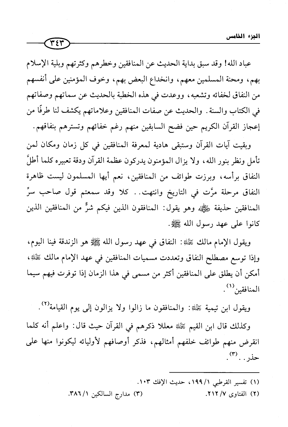 وبقيت آيات القرآن وستبقى هادية لمعرفة المنافقين في كل زمان ومكان لمن تأمل ونظر بنور الله، ولا يزال المؤمنون يدركون عظمة القرآن ودقة تعبيره كلما أطلَّ النفاق برأسه، وبرزت طوائف من المنافقين، نعم أيها المسلمون ليست ظاهرة النفاق مرحلة مرَّت في التاريخ وانتهت .. كلا وقد سمعتم قول صاحب سرِّ المنافقين حذيفة رضي الله عنه وهو يقول: المنافقون الذين فيكم شرٌّ من المنافقين الذين كانوا على عهد رسول الله صلى الله عليه وسلم. ويقول الإمام مالك رحمه الله: النفاق في عهد رسول الله صلى الله عليه وسلم هو الزندقة فينا اليوم، وإذا توسع مصطلح النفاق وتعددت مسميات المنافقين في عهد الإمام مالك رحمه الله، أمكن أن يطلق على المنافقين أكثر من مسمى في هذا الزمان إذا توفرت فيهم سيما المنافقين (¬1).