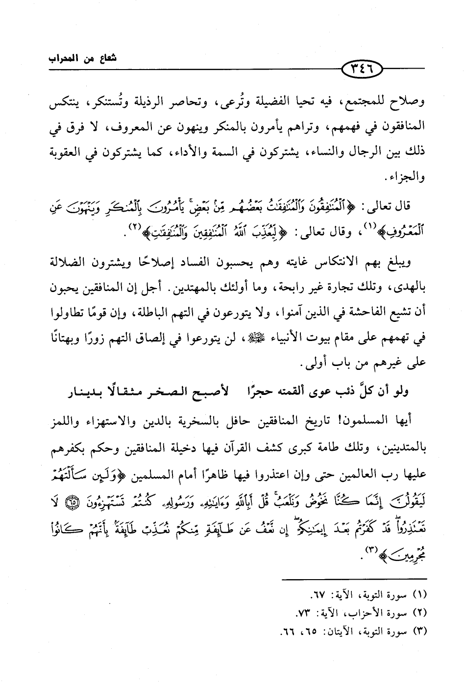 وصلاح للمجتمع، فيه تحيا الفضيلة وتُرعى، وتحاصر الرذيلة وتُستنكر، ينتكس المنافقون في فهمهم، وتراهم يأمرون بالمنكر وينهون عن المعروف، لا فرق في ذلك بين الرجال والنساء، يشتركون في السمة والأداء، كما يشتركون في العقوبة والجزاء. قال تعالى: {المنافقون والمنافقات بعضهم من بعض يأمرون بالمنكر وينهون عن المعروف} (¬1)، وقال تعالى: {ليعذب الله المنافقين والمنافقات} (¬2).
