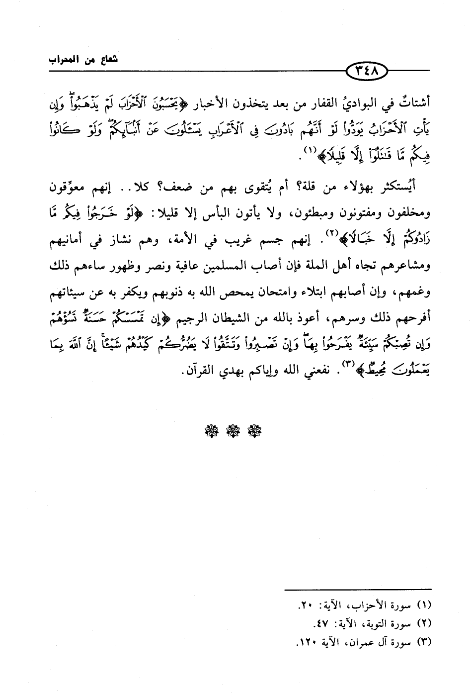 أيُستكثر بهؤلاء من قلة؟ أم يُتقوى بهم من ضعف؟ كلا .. إنهم معوِّقون ومخلفون ومفتونون ومبطئون، ولا يأتون البأس إلا قليلا: {لو خرجوا فيكم ما زادوكم إلا خبالا} (¬2). إنهم جسم غريب في الأمة، وهم نشاز في أمانيهم ومشاعرهم تجاه أهل الملة فإن أصاب المسلمين عافية ونصر وظهور ساءهم ذلك وغمهم، وإن أصابهم ابتلاء وامتحان يمحص الله به ذنوبهم ويكفر به عن سيئاتهم أفرحهم ذلك وسرهم، أعوذ بالله من الشيطان الرجيم {إن تمسسكم حسنة تسؤهم وإن تصبكم سيئة يفرحوا بها وإن تصبروا وتتقوا لا يضركم كيدهم شيئا إن الله بما يعملون محيط} (¬3). نفعني الله وإياكم بهدي القرآن.