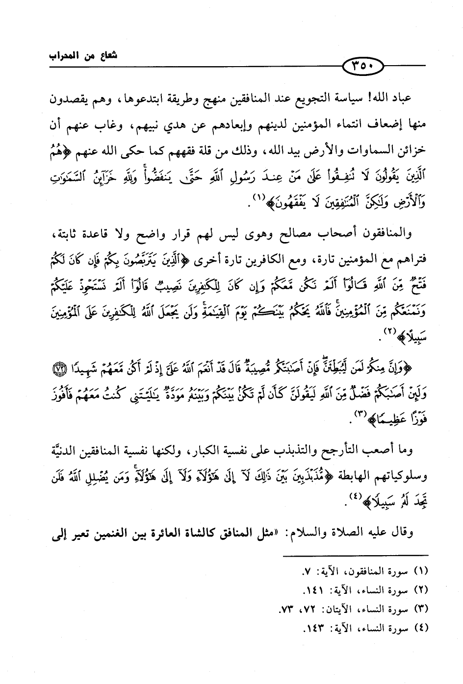 وما أصعب التأرجح والتذبذب على نفسية الكبار، ولكنها نفسية المنافقين الدنيَّة وسلوكياتهم الهابطة {مذبذبين بين ذلك لا إلى هؤلاء ولا إلى هؤلاء ومن يضلل الله فلن تجد له سبيلا} (¬4). وقال عليه الصلاة والسلام: ((مثل المنافق كالشاة العائرة بين الغنمين تعير إلى