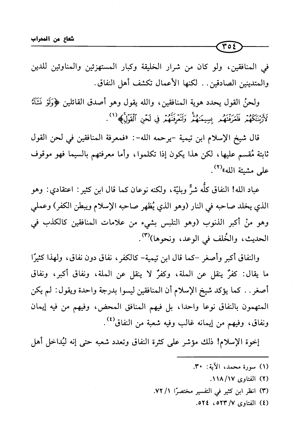 قال شيخ الإسلام ابن تيمية يرحمه الله: ((فمعرفة المنافقين في لحن القول ثابتة مُقسم عليها، لكن هذا يكون إذا تكلموا، وأما معرفتهم بالسيما فهو موقوف على مشيئة الله)) (¬2).