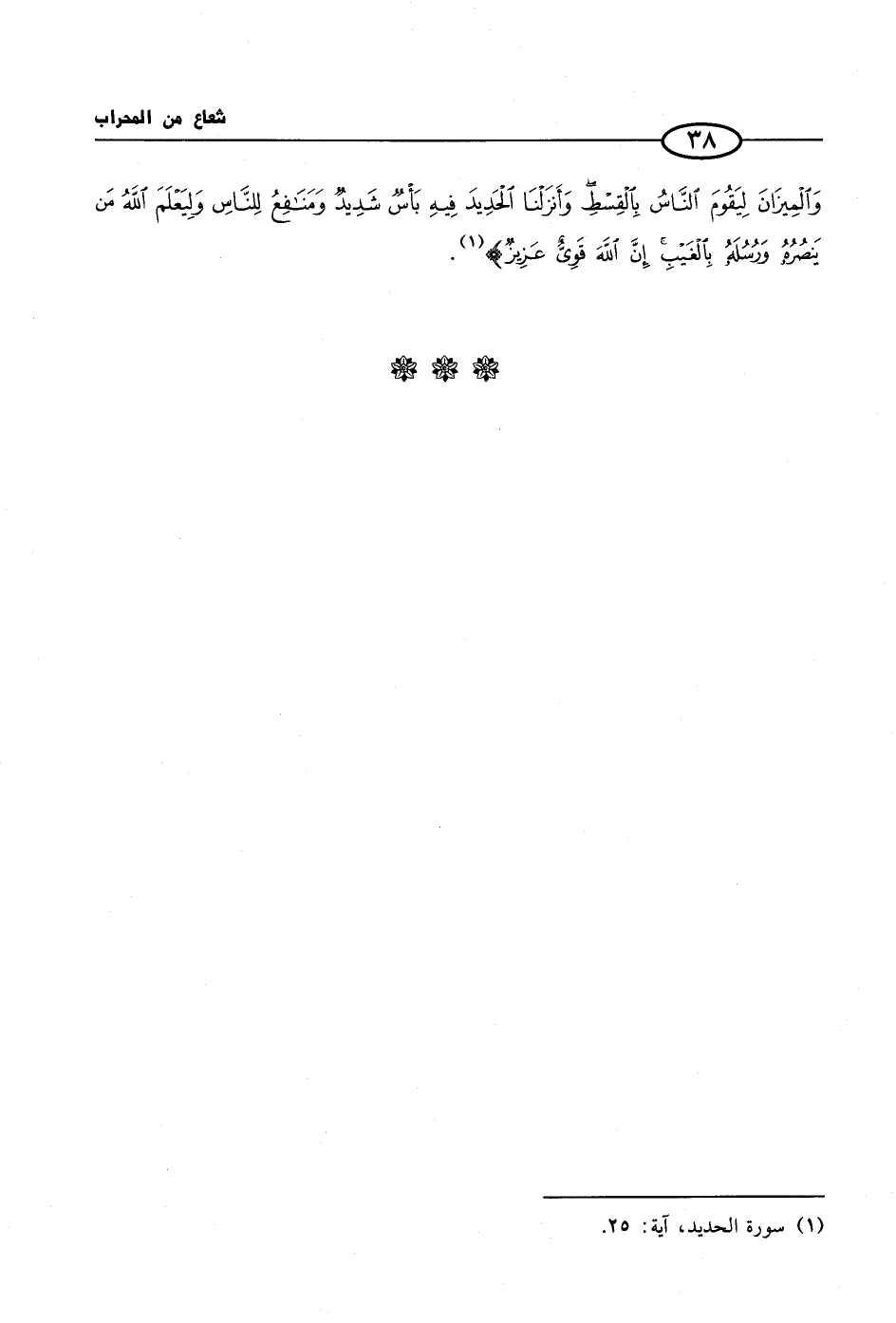 والميزان ليقوم الناس بالقسط وأنزلنا الحديد فيه بأس شديد ومنافع للناس وليعلم الله من ينصره ورسله بالغيب إن الله قوي عزيز} (¬1).
