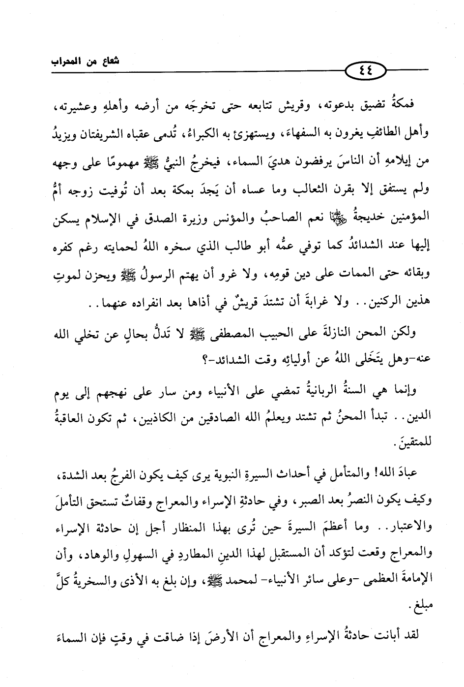 عبادَ الله! والمتأمل في أحداث السيرةِ النبوية يرى كيف يكون الفرجُ بعد الشدة، وكيف يكون النصرُ بعد الصبر، وفي حادثةِ الإسراء والمعراج وقفاتٌ تستحق التأملَ والاعتبار .. وما أعظمَ السيرةَ حين تُرى بهذا المنظار أجل إن حادثة الإسراء والمعراج وقعت لتؤكد أن المستقبل لهذا الدينِ المطاردِ في السهولِ والوهاد، وأن الإمامةَ العظمى-وعلى سائر الأنبياء- لمحمد صلى الله عليه وسلم، وإن بلغ به الأذى والسخريةُ كلَّ مبلغ.