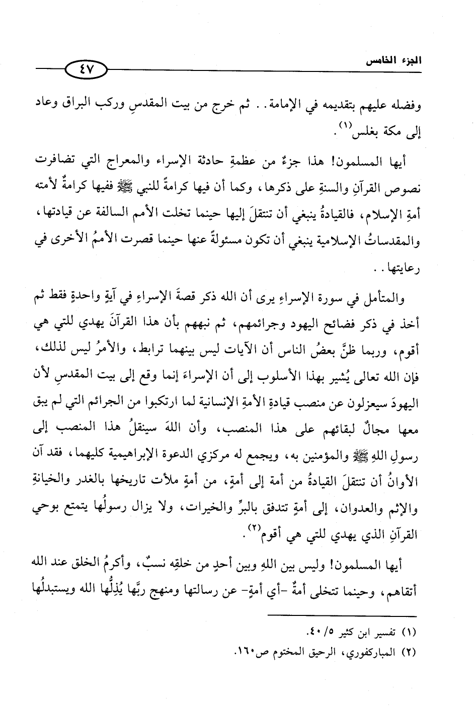 أيها المسلمون! هذا جزءٌ من عظمةِ حادثة الإسراء والمعراج التي تضافرت نصوص القرآنِ والسنةِ على ذكرها، وكما أن فيها كرامةً للنبي صلى الله عليه وسلم ففيها كرامةٌ لأمته أمةِ الإسلام، فالقيادةُ ينبغي أن تنتقلَ إليها حينما تخلت الأمم السالفة عن قيادتها، والمقدساتُ الإسلامية ينبغي أن تكون مسئولةً عنها حينما قصرت الأممُ الأخرى في رعايتها ..