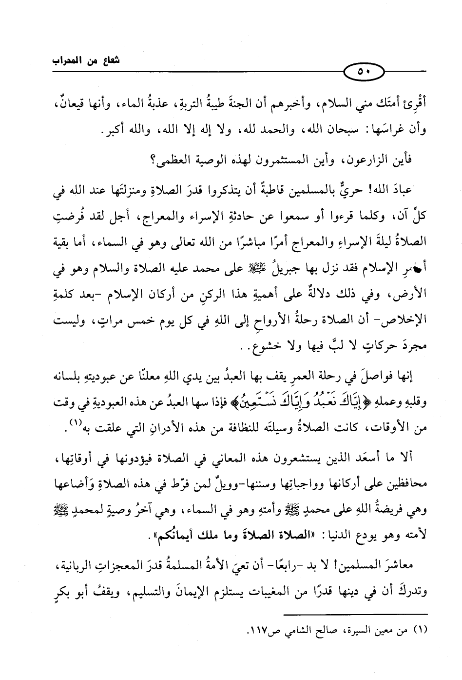 ألا ما أسعَد الذين يستشعرون هذه المعاني في الصلاة فيؤدونها في أوقاتِها، محافظين على أركانها وواجباتِها وسننها-وويلٌ لمن فرّط في هذه الصلاةِ وَأضاعها وهي فريضةُ اللهِ على محمدٍ صلى الله عليه وسلم وأمتهِ وهو في السماء، وهي آخرُ وصيةٍ لمحمدٍ صلى الله عليه وسلم لأمته وهو يودع الدنيا ((الصلاة الصلاةَ وما ملك أيمانُكم)).