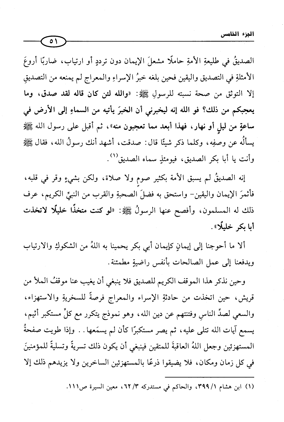 الصديقُ في طليعةِ الأمةِ حاملًا مشعلَ الإيمان دون ترددٍ أو ارتياب، ضاربًا أروعَ الأمثلةِ في التصديق واليقين فحين بلغه خبرُ الإسراءِ والمعراج لم يمنعه من التصديقِ إلا التوثق من صحة نسبته للرسولِ صلى الله عليه وسلم ((والله لئن كان قاله لقد صدق، وما يعجبكم من ذلك؟ فو الله إنه ليخبرني أن الخبرَ يأتيه من السماءِ إلى الأرض في ساعةٍ من ليلٍ أو نهار، فهذا أبعد مما تعجبون منه))، ثم أقبل على رسول الله صلى الله عليه وسلم يسألُه عن وصفِه، وكلما ذكر شيئًا قال: صدقت، أشهد أنك رسولُ الله، فقال صلى الله عليه وسلم وأنت يا أبا بكر الصديق، فيومئذٍ سماه الصديق (¬1).