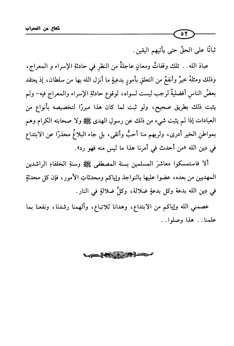 عبادَ الله .. تلك وقفاتٌ ومعانٍ عاجلةٌ من النظرِ في حادثةِ الإسراء والمعراج، وذلك ومثلهُ خيرٌ وأنفعُ من التعلقِ بأمورٍ بدعيةٍ ما أنزل الله بها من سلطان، إذ يعتقد بعضُ الناسِ أفضليةً لرجب ليست لسواه، لوقوع حادثةِ الإسراء والمعراج فيه- ولم يثبت ذلك بطريق صحيح، ولو ثبت لما كان هذا مبررًا لتخصيصه بأنواع من العبادات إذا لم يثبت شيء من ذلك عن رسولِ الهدى صلى الله عليه وسلم ولا صحابته الكرام وهم بمواطنِ الخير أدرى، ولربهم منا أحبُّ وأتقى، بل جاء البلاغُ محذرًا عن الابتداع في دين الله ((من أحدث في أمرنا هذا ما ليس منه فهو رد)).