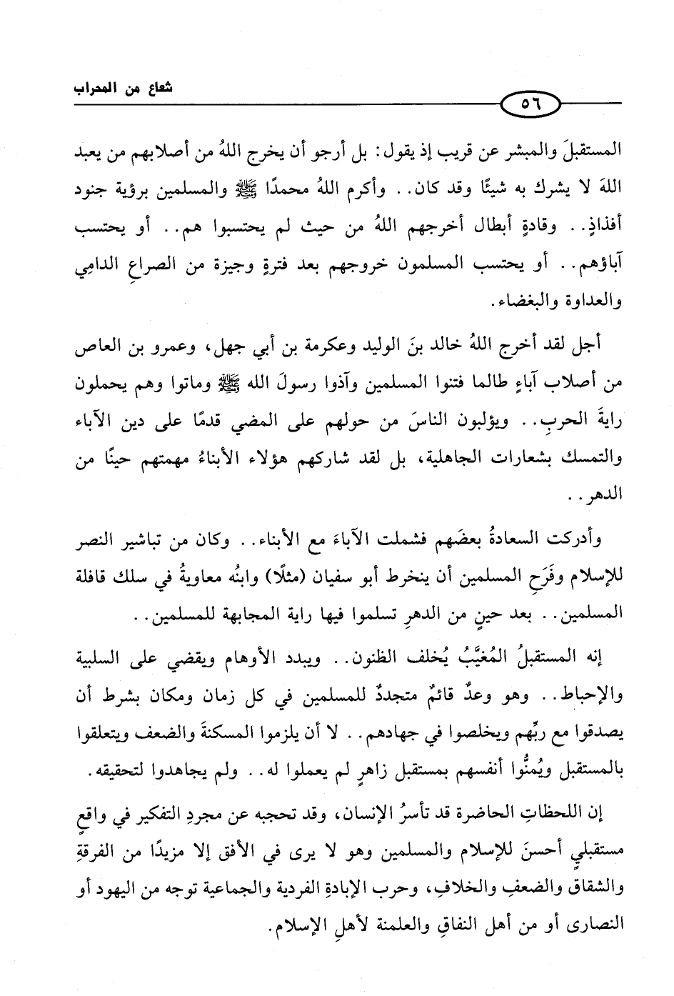 المستقبلَ والمبشر عن قريب إذ يقول: بل أرجو أن يخرج اللهُ من أصلابهم من يعبد اللهَ لا يشرك به شيئًا وقد كان .. وأكرم اللهُ محمدًا صلى الله عليه وسلم والمسلمين برؤية جنود أفذاذٍ .. وقادةٍ أبطال أخرجهم اللهُ من حيث لم يحتسبوا هم .. أو يحتسب آباؤهم .. أو يحتسب المسلمون خروجهم بعد فترةٍ وجيزة من الصراعِ الدامِي والعداوة والبغضاء.