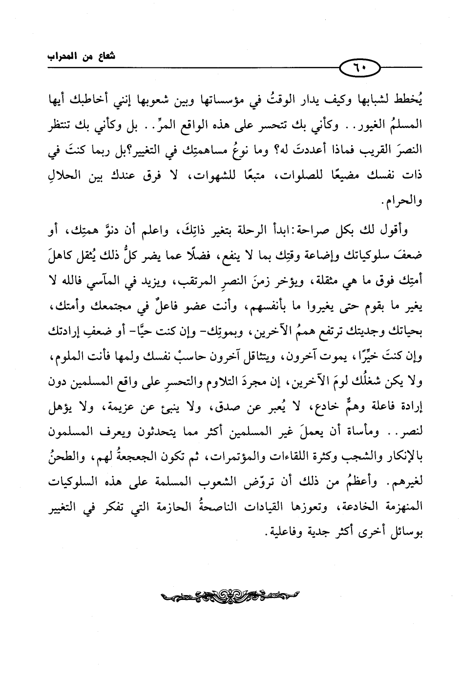يُخطط لشبابها وكيف يدار الوقتُ في مؤسساتها وبين شعوبها إنني أخاطبك أيها المسلمُ الغيور .. وكأني بك تتحسر على هذه الواقع المرِّ .. بل وكأني بك تنتظر النصرَ القريب فماذا أعددتَ له؟ وما نوعُ مساهمتِك في التغيير؟ بل ربما كنتَ في ذات نفسك مضيعًا للصلوات، متبعًا للشهوات، لا فرق عندك بين الحلالِ والحرام.