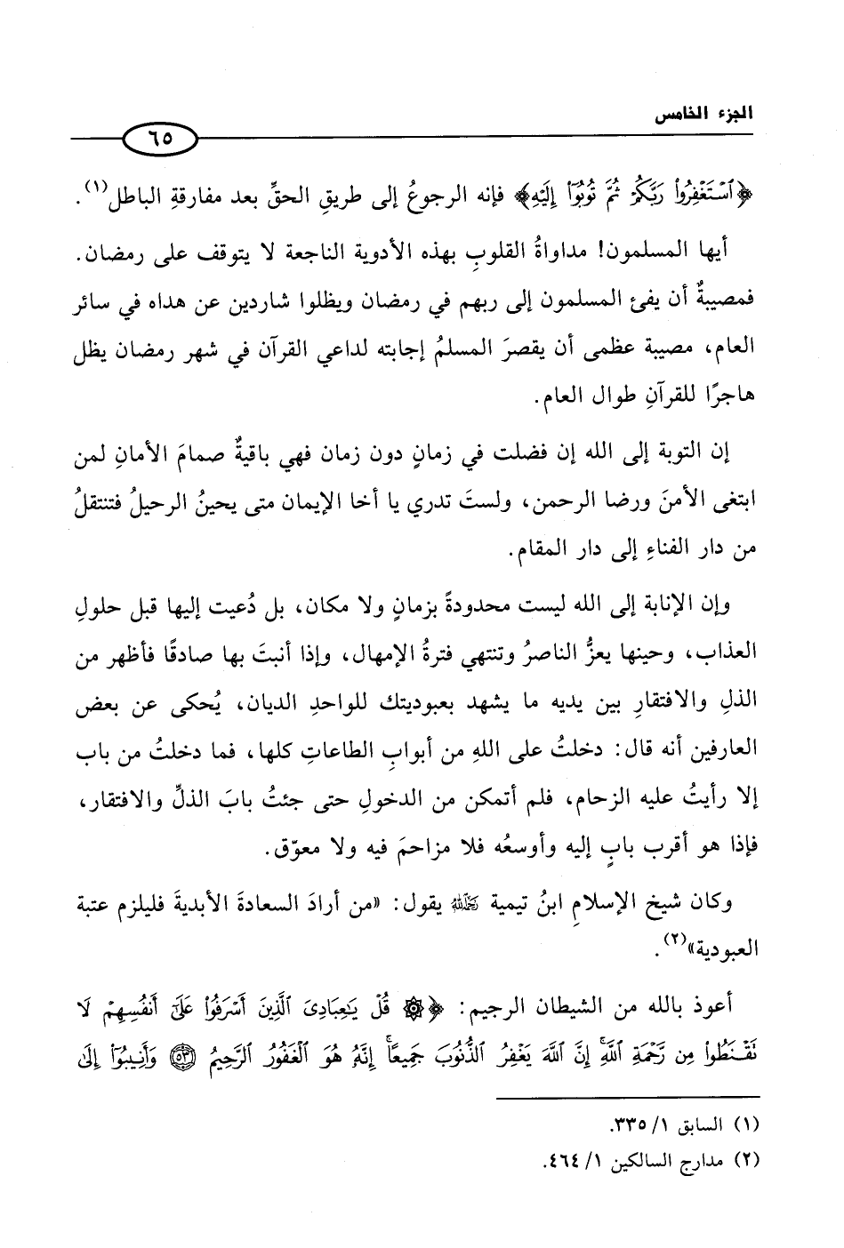 أيها المسلمون! مداواةُ القلوبِ بهذه الأدوية الناجعة لا يتوقف على رمضان. فمصيبةٌ أن يفئ المسلمون إلى ربهم في رمضان ويظلوا شاردين عن هداه في سائر العام، مصيبة عظمى أن يقصرَ المسلمُ إجابته لداعي القرآن في شهر رمضان يظل هاجرًا للقرآنِ طوال العام.