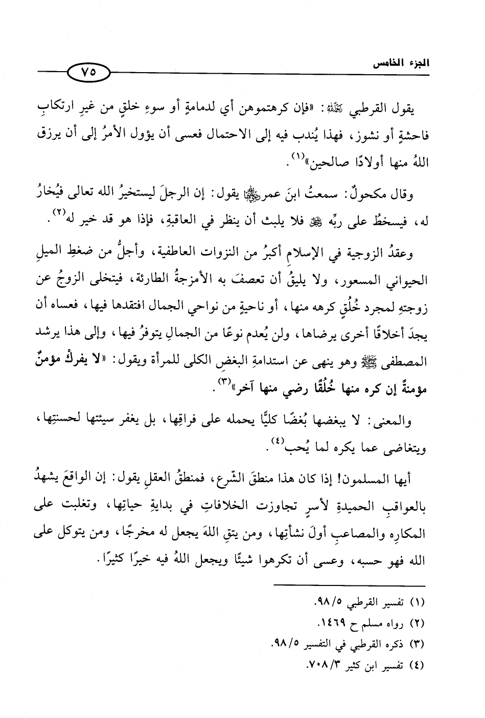 وعقدُ الزوجية في الإسلامِ أكبرُ من النزوات العاطفية، وأجلُّ من ضغطِ الميلِ الحيواني المسعور، ولا يليقُ أن تعصفَ به الأمزجةُ الطارئة، فيتخلى الزوجُ عن زوجتهِ لمجرد خُلُقٍ كرهه منها، أو ناحيةٍ من نواحي الجمال افتقدها فيها، فعساه أن يجدَ أخلاقًا أخرى يرضاها، ولن يُعدم نوعًا من الجمالِ يتوفرُ فيها، وإلى هذا يرشد المصطفى صلى الله عليه وسلم وهو ينهى عن استدامةِ البغضِ الكلى للمرأة ويقول: ((لا يفركْ مؤمنٌ مؤمنةً إن كره منها خُلُقًا رضي منها آخر)) (¬3).