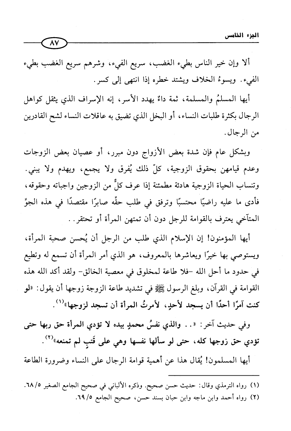أيها المؤمنون! إن الإسلام الذي طلب من الرجل أن يُحسن صحبة المرأة، ويستوصي بها خيرًا ويعاشرها بالمعروف، هو الذي أمر المرأة أن تسمع له وتطيع في حدود ما أحل الله- فلا طاعة لمخلوق في معصية الخالق- ولقد أكد الله هذه القوامة في القرآن، وبلغ الرسول صلى الله عليه وسلم في تشديد طاعة الزوجة زوجها أن يقول: ((لو كنت آمرًا أحدًا أن يسجد لأحدٍ، لأمرتُ المرأة أن تسجد لزوجها)) (¬1).