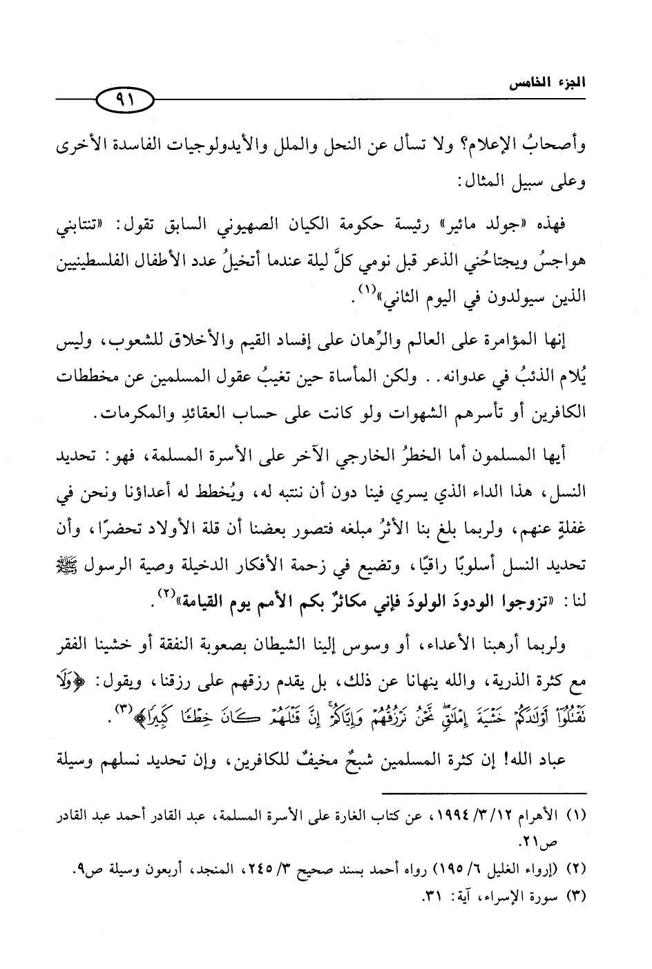 ولربما أرهبنا الأعداء، أو وسوس إلينا الشيطان بصعوبة النفقة أو خشينا الفقر مع كثرة الذرية، والله ينهانا عن ذلك، بل يقدم رزقهم على رزقنا، ويقول: {ولا تقتلوا أولادكم خشية إملاق نحن نرقهم وإياكم إن قتلهم كان خطئا كبيرا} (¬3).