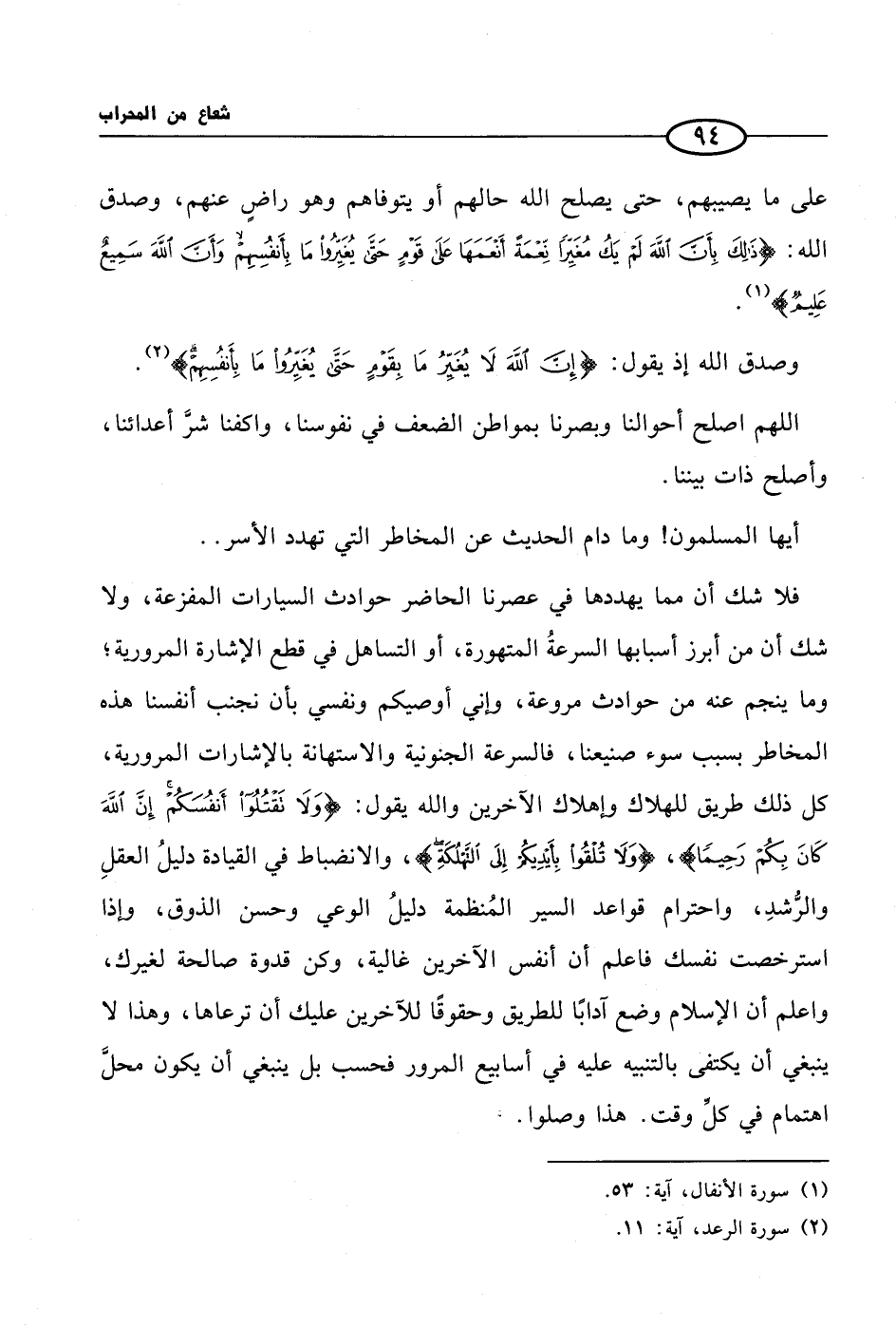 فلا شك أن مما يهددها في عصرنا الحاضر حوادث السيارات المفزعة، ولا شك أن من أبرز أسبابها السرعةُ المتهورة، أو التساهل في قطع الإشارة المرورية؛ وما ينجم عنه من حوادث مروعة، وإني أوصيكم ونفسي بأن نجنب أنفسنا هذه المخاطر بسبب سوء صنيعنا، فالسرعة الجنونية والاستهانة بالإشارات المرورية، كل ذلك طريق للهلاك وإهلاك الآخرين والله يقول: {ولا تقتلوا أنفسكم إن الله كان بكم رحيما}، {ولا تلقوا بأيديكم إلى التهلكة}، والانضباط في القيادة دليلُ العقلِ والرُّشدِ، واحترام قواعد السير المُنظمة دليلُ الوعي وحسن الذوق، وإذا استرخصت نفسك فاعلم أن أنفس الآخرين غالية، وكن قدوة صالحة لغيرك، واعلم أن الإسلام وضع آدابًا للطريق وحقوقًا للآخرين عليك أن ترعاها، وهذا لا ينبغي أن يكتفى بالتنبيه عليه في أسابيع المرور فحسب بل ينبغي أن يكون محلَّ اهتمام في كلِّ وقت. هذا وصلوا.