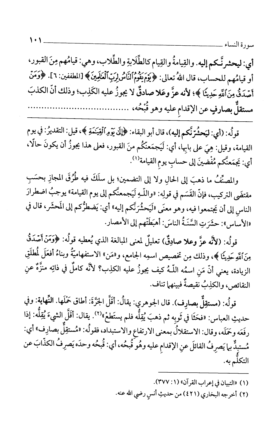 أي: ليحشرنكم إليه. والقيامة والقيام، كالطلابة والطلاب، وهي: قيامهم من القبور، أو قيامهم للحساب، قال اللَّه تعالى: (يَوْمَ يَقُومُ النَّاسُ لِرَبِّ الْعالَمِينَ) [المطففين: 6]. (وَمَنْ أَصْدَقُ مِنَ اللَّهِ حَدِيثاً)؛ لأنه عز وعلا صادق لا يجوز عليه الكذب؛ وذلك أنّ الكذب مستقل بصارفٍ عن الإقدام عليه وهو قبحه،