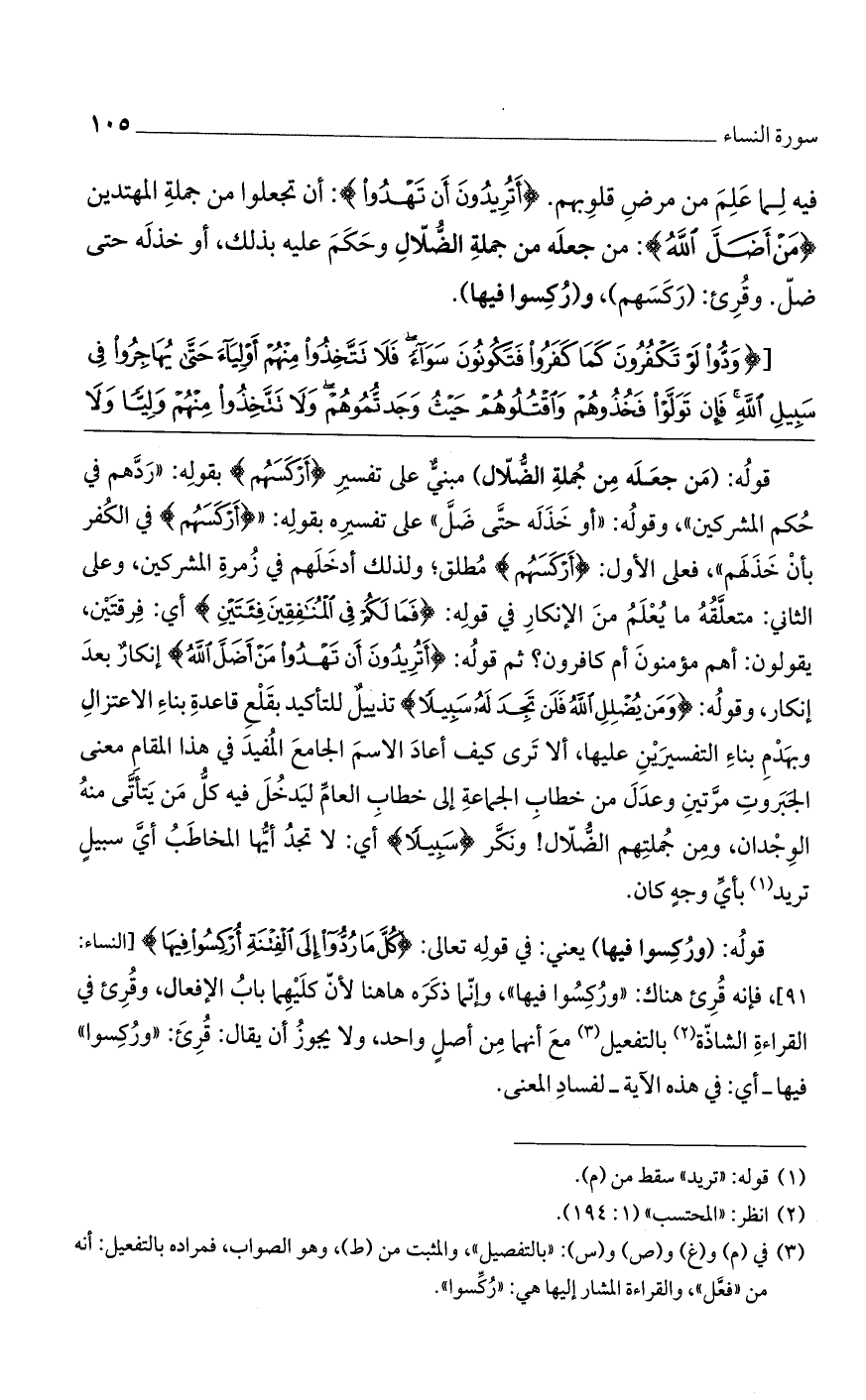 قوله: (ورُكِسوا فيها) يعني: في قوله تعالى: {كُلَّ مَا رُدُّوا إِلَى الْفِتْنَةِ أُرْكِسُوا فِيهَا} [النساء: 91]، فإنه قُرئ هناك: "ورُكِسُوا فيها"، وإنما ذكره هاهنا لن كليهما بابُ الإفعال، وقُرِئ في القراءة الشاذة بالتفعيل مع أنهما من أصلٍ واحد، ولا يجوزُ أن يقال: قُرِئَ: "ورُكِسوا" فيها- أي: في هذه الآية - لفسادِ المعنى.