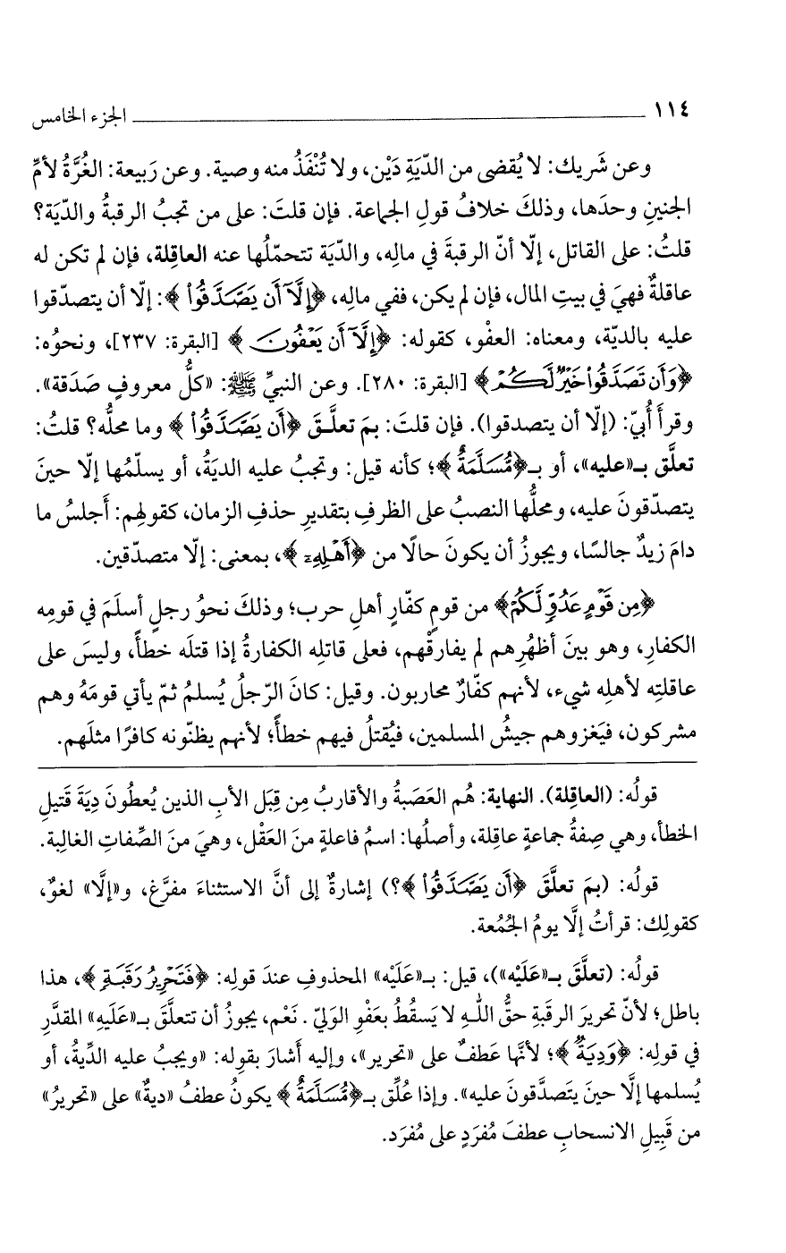 وعن شريك: لا يقضى من الدية دين، ولا تنفذ وصية. وعن ربيعة: الغرة لأم الجنين وحدها، وذلك خلاف قول الجماعة. (فإن قلت): على من تجب الرقبة والدية؟ قلت: على القاتل إلا أن الرقبة في ماله، والدية تتحملها عنه العاقلة، فإن لم تكن له عاقلة فهي في بيت المال، فإن لم يكن، ففي ماله (إِلَّا أَنْ يَصَّدَّقُوا): إلا أن يتصدقوا عليه بالدية، ومعناه: العفو، كقوله: (إِلَّا أَنْ يَعْفُونَ) [البقرة: 237]، ونحوه: (وَأَنْ تَصَدَّقُوا خَيْرٌ لَكُمْ) [البقرة: 280]. وعن النبي صلى اللَّه عليه وسلم: «كل معروف صدقة». وقرأ أبيّ: (إلا أن يتصدقوا). فإن قلت: بم تعلق (أن يصدقوا) وما محله؟ قلت: تعلق بـ"عليه"، أو بـ (مسلمة)؛ كأنه قيل: وتجب عليه الدية، أو يسلمها إلا حين يتصدقون عليه، ومحلها النصب على الظرف بتقدير حذف الزمان، كقولهم: أجلس ما دام زيد جالساً، ويجوز أن يكون حالاً من (أهله)، بمعنى: إلا متصدقين.