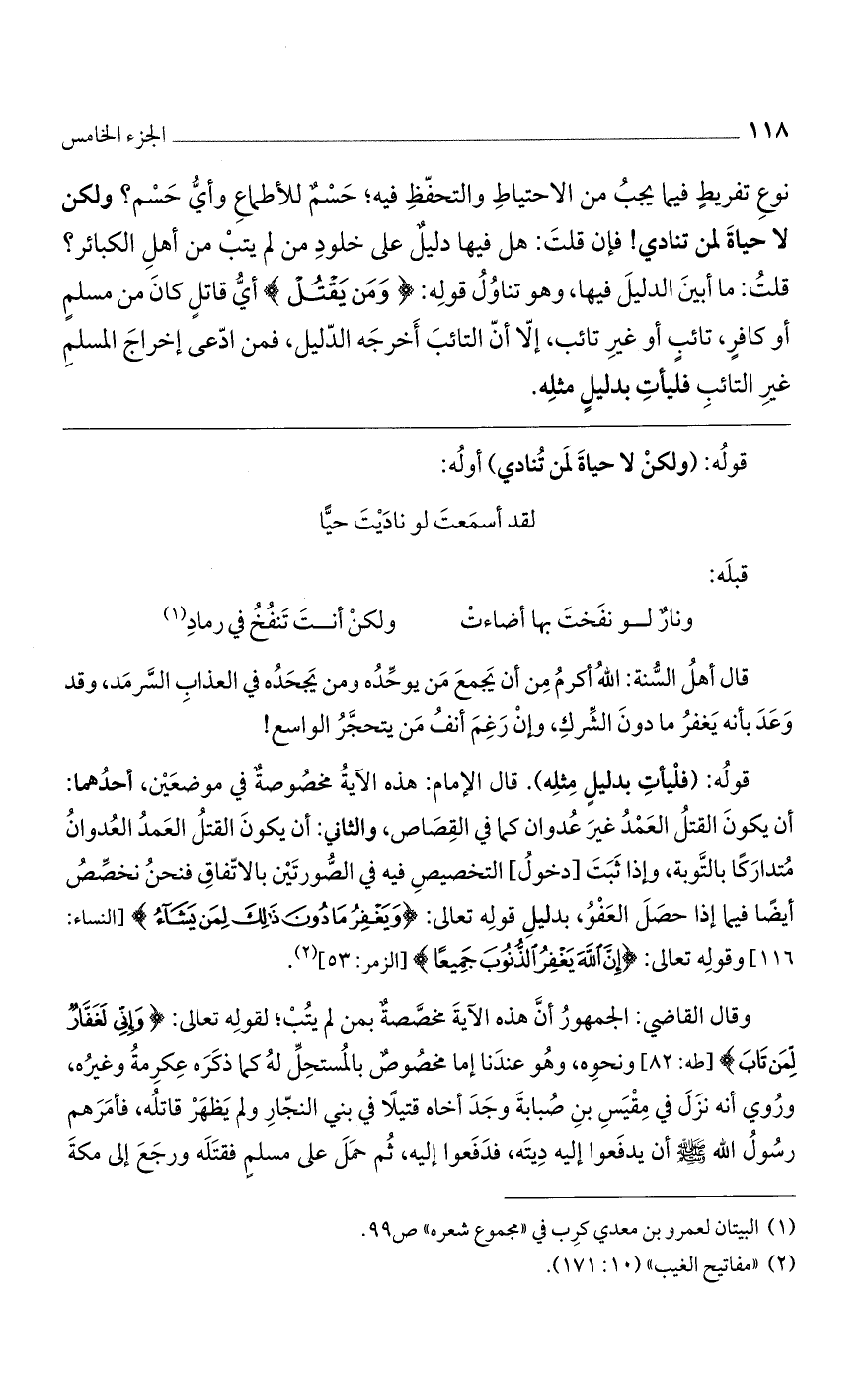 قوله: (فليأت بدليل مثله). قال الإمام: هذه الآية مخصوصة في موضعين، أحدهما: أن يكون القتل العمد غير عدوان كما في القصاص، والثاني: أن يكون القتل العمد العدوان متداركاً بالتوبة، وإذا ثبت [دخول] التخصيص فيه في الصورتين بالاتفاق فنحن نخصص أيضاً فيما إذا حصل العفو، بدليل قوله تعالى: {وَيَغْفِرُ مَا دُونَ ذَلِكَ لِمَنْ يَشَاءُ} [النساء: 116] وقوله تعالى: {إِنَّ اللَّهَ يَغْفِرُ الذُّنُوبَ جَمِيعاً} [الزمر: 53].