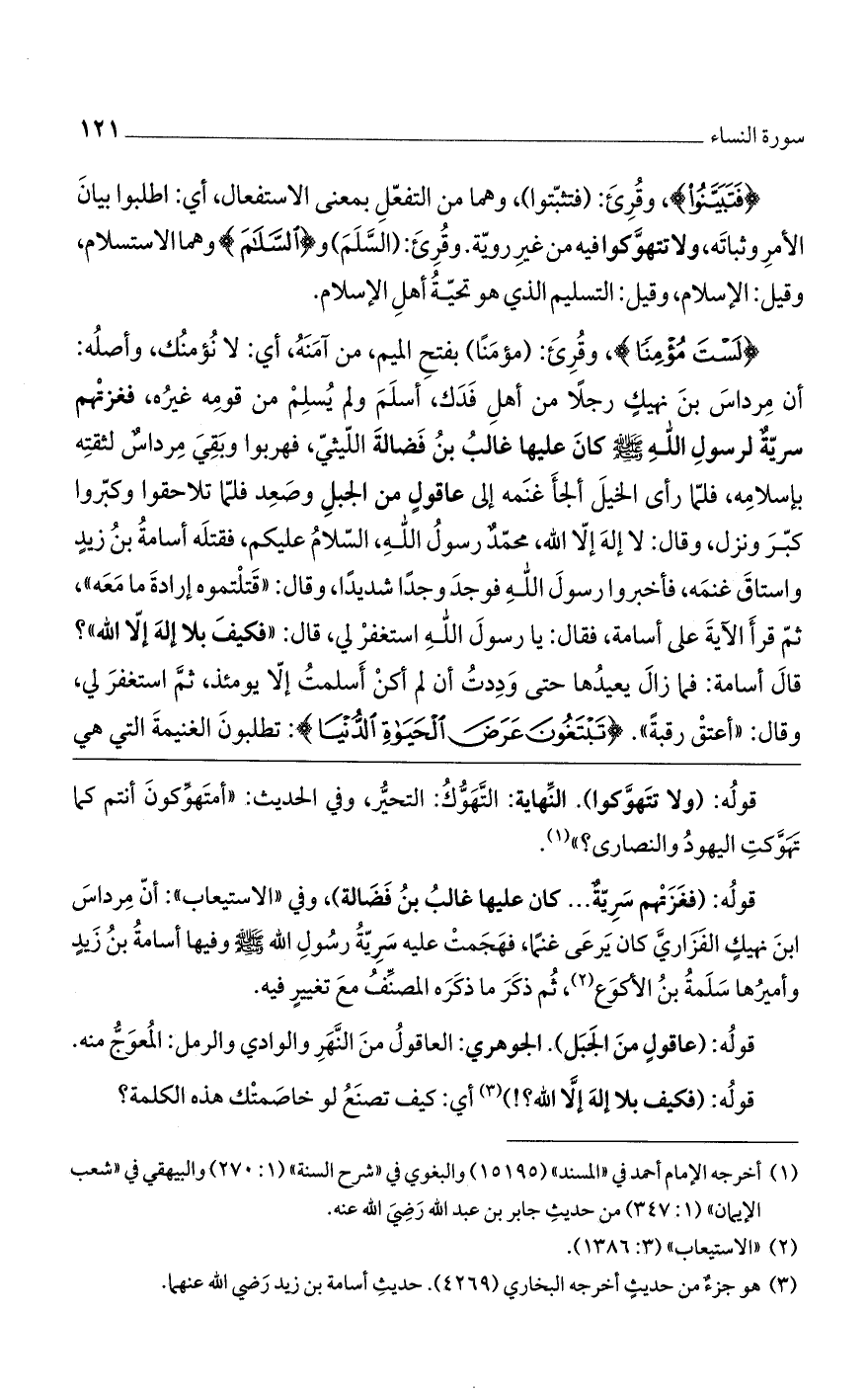 (لَسْتَ مُؤْمِناً)، وقرئ: (مؤمناً) بفتح الميم، من آمنه، أي: لا نؤمنك، وأصله: أن مرادس بن نهيكٍ رجلاً من أهل فدك، أسلم ولم يسلم من قومه غيره، فغزتهم سرية لرسول اللَّه صلى اللَّه عليه وسلم كان عليها غالب بن فضالة الليثي، فهربوا وبقي مرداس لثقته بإسلامه، فلما رأى الخيل ألجأ غنمه إلى عاقولٍ من الجبل وصعد فلما تلاحقوا وكبروا كبر ونزل، وقال: لا إله إلا اللَّه محمد رسول اللَّه، السلام عليكم، فقتله أسامة بن زيد واستاق غنمه، فأخبروا رسول اللَّه فوجد وجداً شديداً، وقال: "قتلتموه إرادة ما معه"، ثم قرأ الآية على أسامة، فقال: يا رسول اللَّه استغفر لي، قال: "فكيف بلا إله إلا اللَّه"؟ قال أسامة: فما زال يعيدها حتى وددت أن لم أكن أسلمت إلا يومئذ، ثم استغفر لي، وقال: "أعتق رقبة". (تَبْتَغُونَ عَرَضَ الْحَياةِ الدُّنْيا): تطلبون الغنيمة التي هي