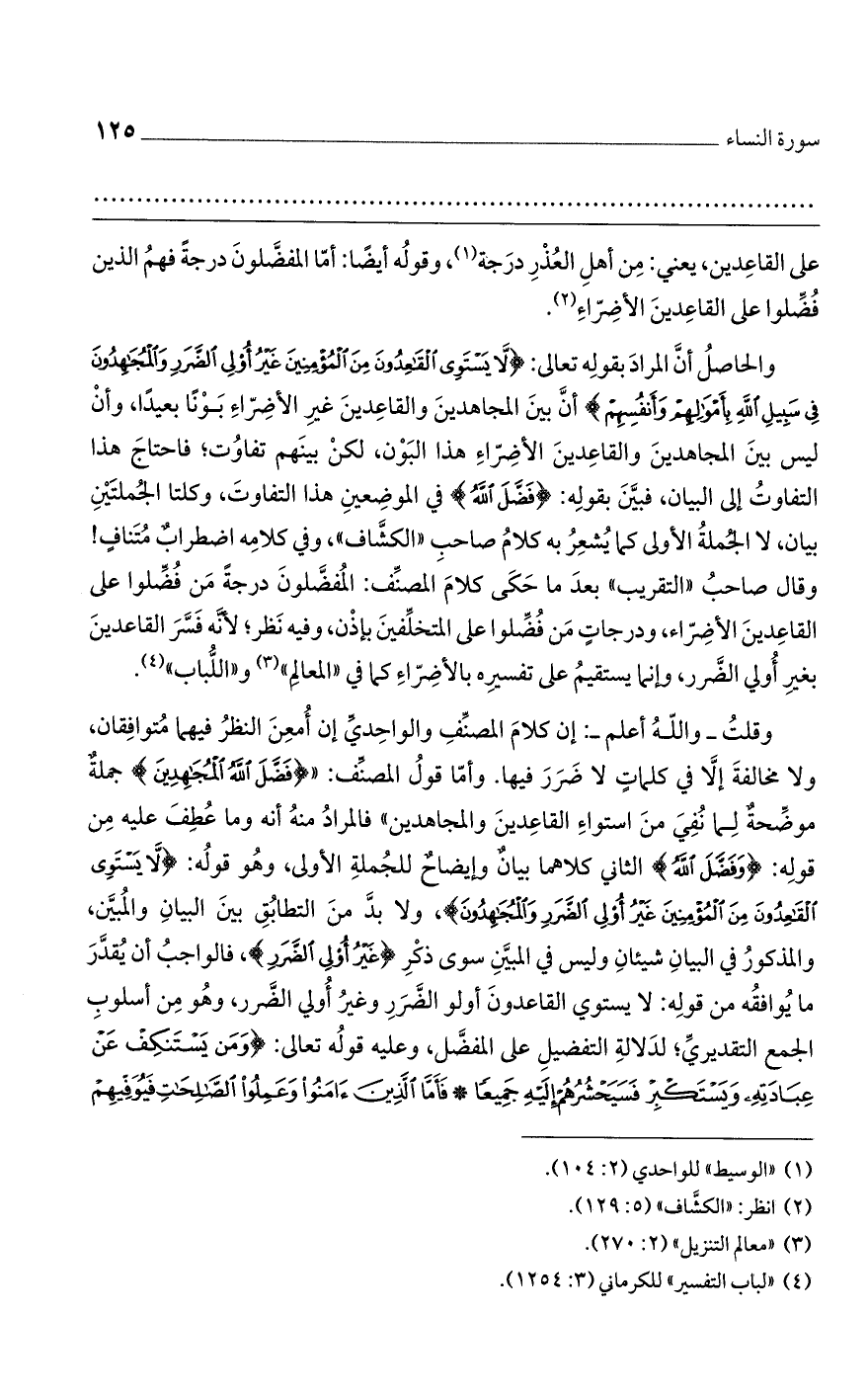 وقلت- والله أعلم-: إن كلام المصنف والواحدي إن أمعن النظر فيهما متوافقان، ولا مخالفة إلا في كلمات لا ضرر فيها. وأما قول المصنف: {فَضَّلَ اللَّهُ الْمُجَاهِدِينَ} جملة موضحة لما نُفي من استواء القاعدين والمجاهدين" فالمراد منه أنه وما عطف عليه من قوله: {فَضَّلَ اللَّهُ} الثاني كلاهما بيان وإيضاح للجملة الأولى، وهو قوله: {لا يَسْتَوِي الْقَاعِدُونَ مِنْ الْمُؤْمِنِينَ غَيْرُ أُوْلِي الضَّرَرِ وَالْمُجَاهِدُونَ}، ولابد من التطابق بين البيان والمبيَّن، والمذكور في البيان شيئان وليس في المبين سوى ذكر {غَيْرُ أُوْلِي الضَّرَرِ}، فالواجب أن يقدر ما يوافقه من قوله: لا يستوي القاعدون أولو الضرر وغير أولي الضرر، وهو من أسلوب الجمع التقديري؛ لدلالة التفضيل على المفضل، وعليه قوله تعالى: {وَمَنْ يَسْتَنكِفْ عَنْ عِبَادَتِهِ وَيَسْتَكْبِرْ فَسَيَحْشُرُهُمْ إِلَيْهِ جَمِيعاً * فَأَمَّا الَّذِينَ آمَنُوا وَعَمِلُوا الصَّالِحَاتِ فَيُوَفِّيهِمْ