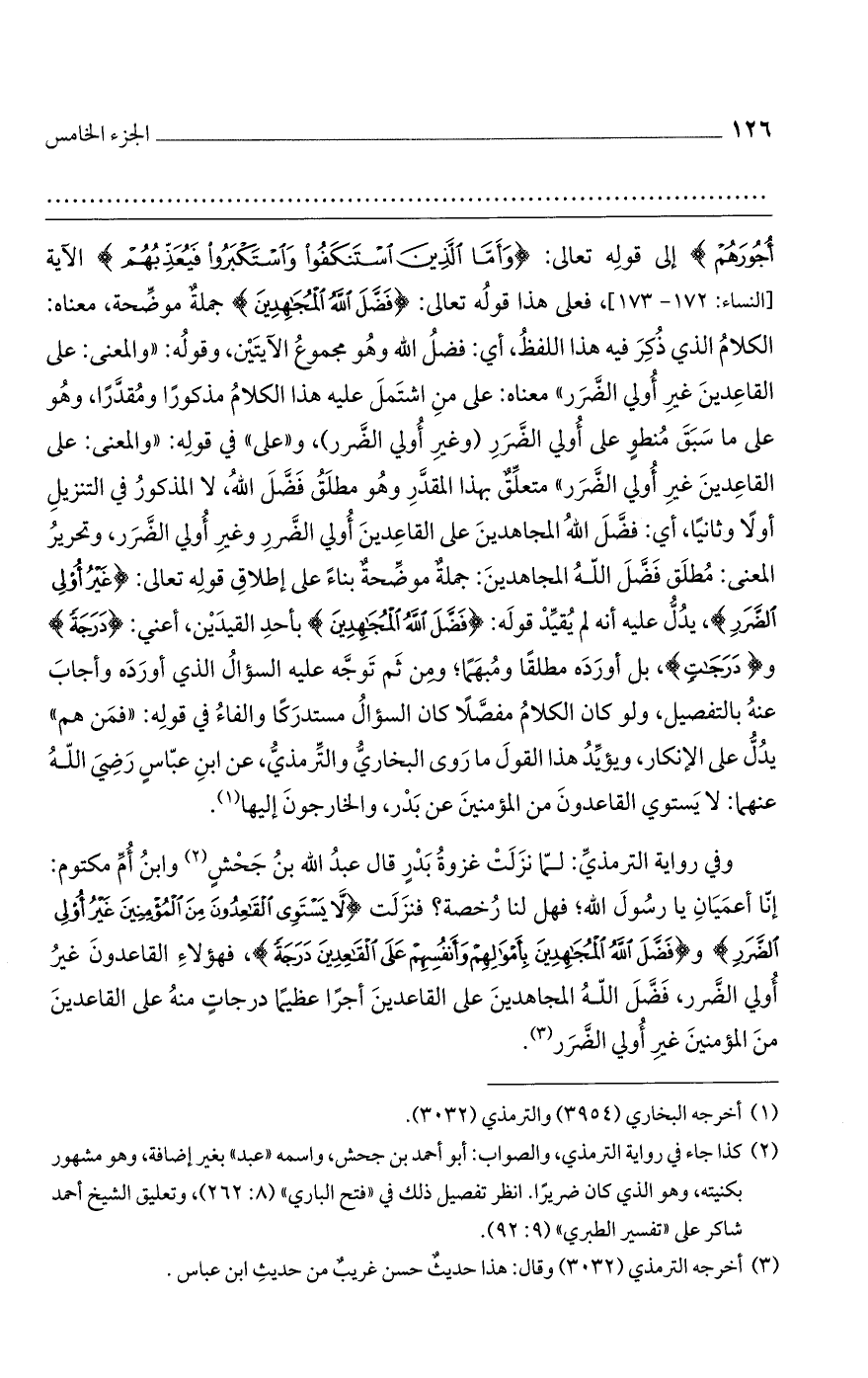 وفي رواية الترمذي: لما نزلت غزوة بدر قال عبد الله بن جحش وابن أم مكتوم: إنا أعميان يا رسول الله؛ فهل لنا رخصة؟ فنزلت {لا يَسْتَوِي الْقَاعِدُونَ مِنْ الْمُؤْمِنِينَ غَيْرُ أُوْلِي الضَّرَرِ} و {فَضَّلَ اللَّهُ الْمُجَاهِدِينَ بِأَمْوَالِهِمْ وَأَنفُسِهِمْ عَلَى الْقَاعِدِينَ دَرَجَةً}، فهؤلاء القاعدون غير أولي الضرر، فضل الله المجاهدين على القاعدين أجراً عظيماً درجات منه على القاعدين من المؤمنين غير أولي الضرر.