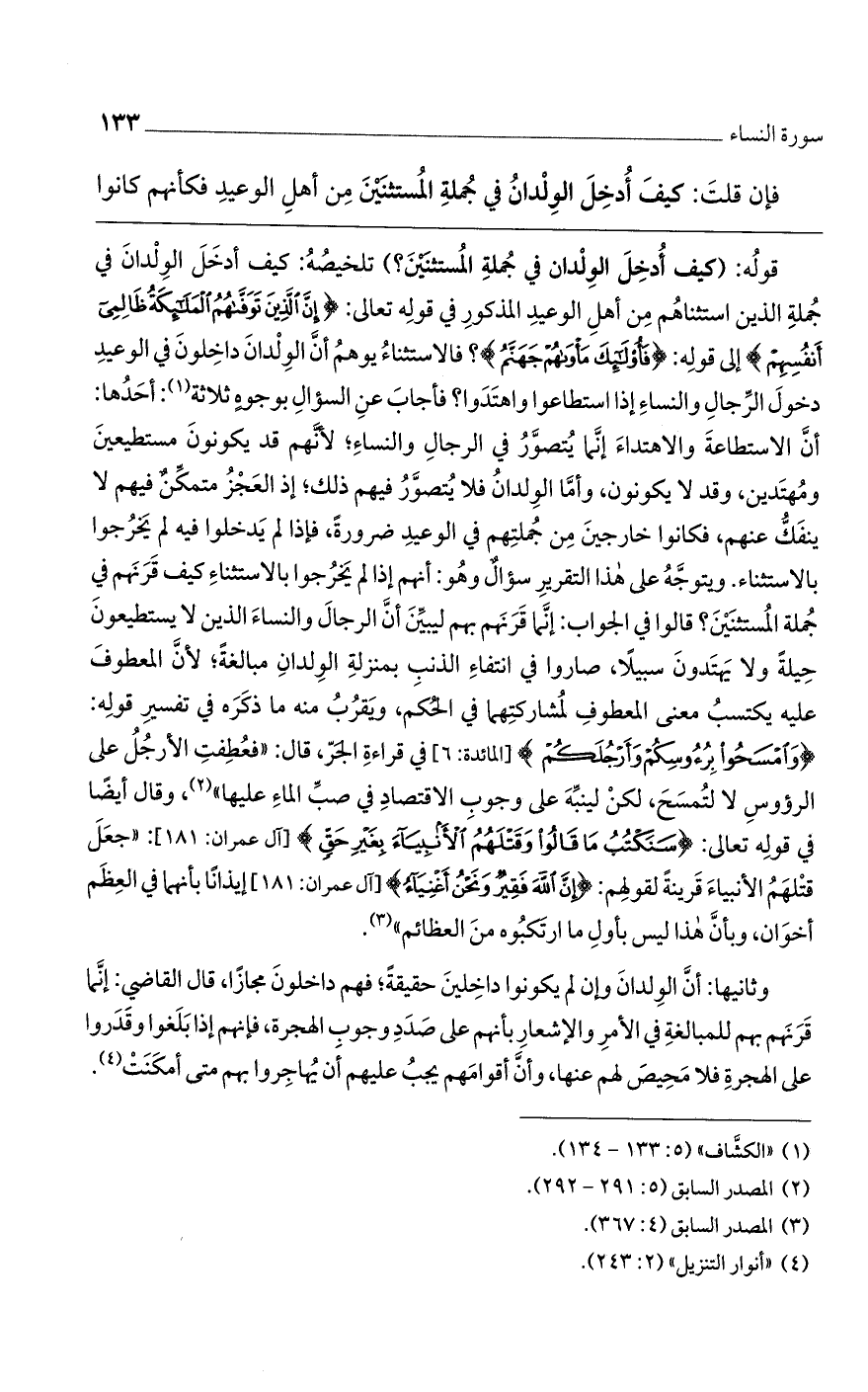 قوله: (كيف أدخل الولدان في جملة المستثنين؟ ) تلخيصه: كيف أدخل الولدان في جملة الذين استثناهم من أهل الوعيد المذكور في قوله تعالى: {إِنَّ الَّذِينَ تَوَفَّاهُمْ الْمَلائِكَةُ ظَالِمِي أَنفُسِهِمْ} إلى قوله: {فَأُوْلَئِكَ مَاوَاهُمْ جَهَنَّمُ}؟ فالاستثناء يوهم أن الولدان داخلون في الوعيد دخول الرجال والنساء إذا استطاعوا واهتدوا؟ فأجاب عن السؤال بوجوه ثلاثة: أحدها: أن الاستطاعة والاهتداء إنما يُتصور في الرجال والنساء؛ لأنهم قد يكونون مستطيعين ومهتدين، وقد لا يكونون، وأما الولدانُ فلايتصور فيهم ذلك؛ إذ العجز متمكن فيهم لا ينفك عنهم، فكانوا خارجين من جملتهم في الوعيد ضرورة، فإذا لم يدخلوا فيه لم يخرجوا بالاستثناء. ويتوجه على هذا التقرير سؤال وهو: أنهم إذا لم يخرجوا بالاستثناء كيف قرنهم في جملة المستثنين؟ قالوا في الجواب: إنما قرنهم بهم ليبين أنا لرجال والنساء الذين لا يستطيعون حيلة ولا يهتدون سبيلاً، صاروا في انتفاء الذنب بمنزلة الولدان مبالغة؛ لأن المعطوف عليه يكتسب معنى المعطوف لمشاركتهما في الحكم، ويقرب منه ما ذكره في تفسير قوله: {وَامْسَحُوا بِرُءُوسِكُمْ وَأَرْجُلَكُمْ} [المائدة: 6] في قراءة الجر، قال: "فعطفت الأرجل على الرؤوس لا لتمسح، لكنه لينبه على وجوب الاقتصاد في صب الماء عليها"، وقال أيضاً في قوله تعالى: {سَنَكْتُبُ مَا قَالُوا وَقَتْلَهُمْ الأَنْبِيَاءَ بِغَيْرِ حَقٍّ} [آل عمران: 181]: "جعل قتلهم الأنبياء قرينة لقولهم: {إِنَّ اللَّهَ فَقِيرٌ وَنَحْنُ أَغْنِيَاءُ} [آل عمران: 181] إيذاناً بأنهما في العظم أخوان، وبأن هذا ليس بأول ما ارتكبوه من العظائم".