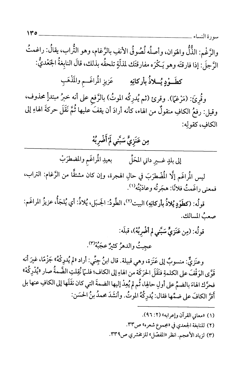 وعنزيٌّ: منسوبٌ إلى عنزة، وهي قبيلة. قال ابن جني: أراد "لم يُدركه" جزماً، غير أنه قوي الوقف على الكلمة فنَقَل الحركة من الهاء إلى الكاف؛ فلما نُقلت الضمة صار "يدركه" فحرك الهاء بالضم على أول حالها، ثم لم يعد إليها الضمة التي كان نقلها إلى الكاف عنها بل أقر الكاف على ضمها فقال: يدركه الموت. وأنشد محمد بن الحسن: