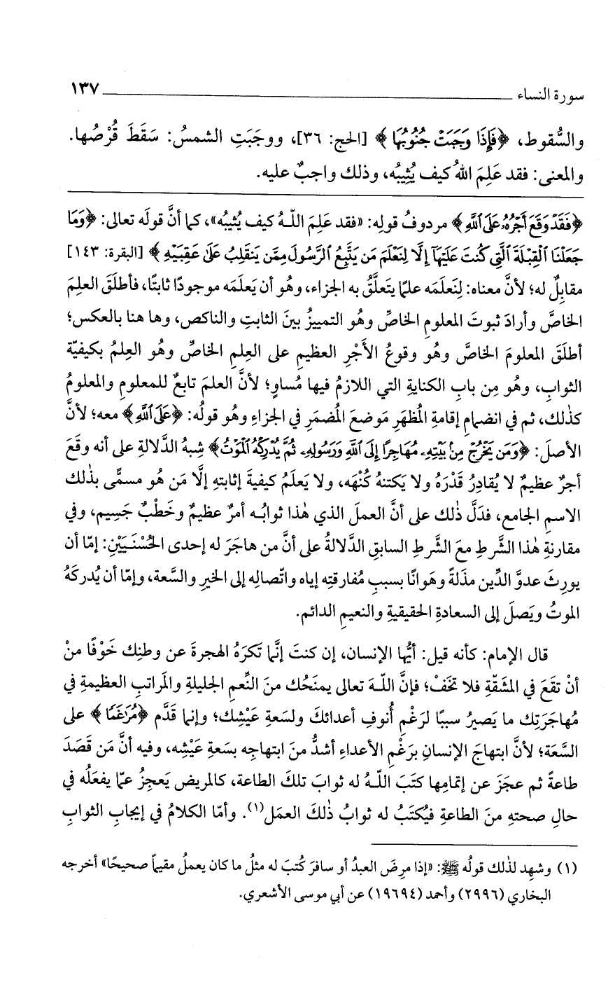 {فَقَدْ وَقَعَ أَجْرُهُ عَلَى اللَّهِ} مردوف قوله: "فقد علم الله كيف يثيبه"، كما أن قوله تعالى: {وَمَا جَعَلْنَا الْقِبْلَةَ الَّتِي كُنتَ عَلَيْهَا إِلاَّ لِنَعْلَمَ مَنْ يَتَّبِعُ الرَّسُولَ مِمَّنْ يَنقَلِبُ عَلَى عَقِبَيْهِ} [البقرة: 143] مقابل له؛ لأن معناه: لنعلمه علماً يتعلق به الجزاء، وهو أن يعلمه موجوداً ثابتاً، فأطلق العلم الخاص وأراد ثبوت المعلم الخاص وهو التمييز بين الثابت والناكص، وها هنا بالعكس؛ أطلق المعلوم الخاص وهو وقوع الأجر العظيم على العلم الخاص وهو العلم بكيفية الثواب، وهو من باب الكناية التي اللازم فيها مساوٍ؛ لأن العلم تابع للمعلوم والمعلوم كذلك، ثم في انضمام إقامة المظهر موضع المضمر في الجزاء وهو قوله: {عَلَى اللَّهِ} معه؛ لأن الأصل: {وَمَنْ يَخْرُجْ مِنْ بَيْتِهِ مُهَاجِراً إِلَى اللَّهِ وَرَسُولِهِ ثُمَّ يُدْرِكْهُ الْمَوْتُ} شبه الدلالة على أنه وقع أجر عظيم لا يُقادر قدره ولا يكتنه كنهه، ولا يعلم كيفية إثابته إلا من هو مسمى بذلك الاسم الجامع، فدل ذلك على أن العمل الذي هذا ثوابه أمرٌ عظيم وخطب جسيم، وفي مقارنة هذا الشرط مع الشرط السابق الدلالة على أن من هاجر له إحدى الحسنيين: إما أن يورث عدو الدين مذلة وهواناً بسبب مفارقته إياه واتصاله إلى الخير والسعة، وغما أن يدركه الموت ويصل إلى السعادة الحقيقية والنعيم الدائم.