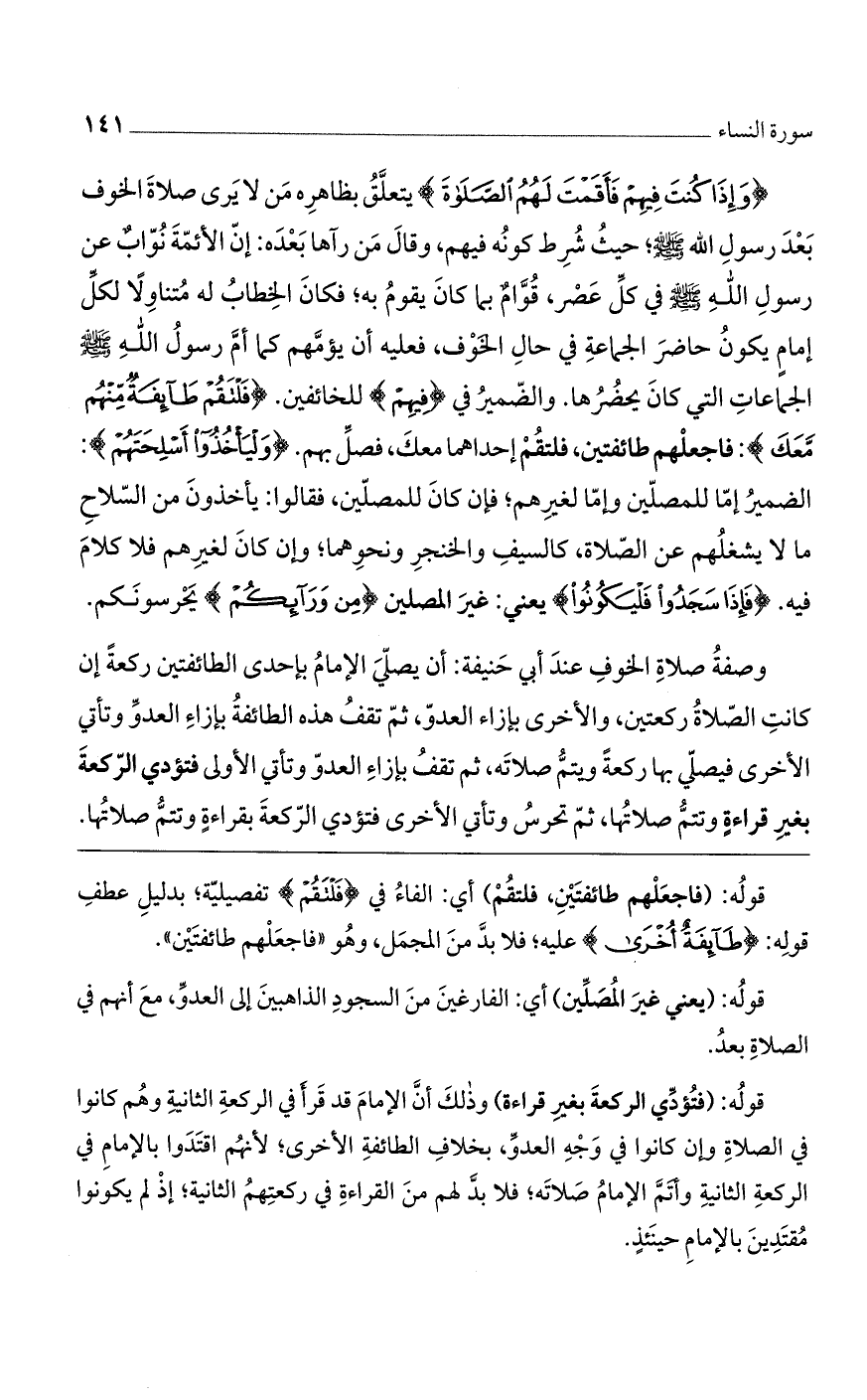 (وَإِذا كُنْتَ فِيهِمْ فَأَقَمْتَ لَهُمُ الصَّلاةَ) يتعلق بظاهره من لا يرى صلاة الخوف بعد رسول اللَّه صلى اللَّه عليه وسلم؛ حيث شرط كونه فيهم، وقال من رآها بعده: إن الأئمة نواب عن رسول اللَّه صلى اللَّه عليه وسلم في كل عصر، قوّام بما كان يقوم به؛ فكان الخطاب له متناولاً لكل إمام يكون حاضر الجماعة في حال الخوف، فعليه أن يؤمّهم كما أمّ رسول اللَّه صلى اللَّه عليه وسلم الجماعات التي كان يحضرها. والضمير في (فِيهِمْ) للخائفين. (فَلْتَقُمْ طائِفَةٌ مِنْهُمْ مَعَكَ): فاجعلهم طائفتين، فلتقم إحداهما معك، فصل بهم. (وَلْيَاخُذُوا أَسْلِحَتَهُمْ): الضمير إمّا للمصلين وإمّا لغيرهم؛ فإن كان للمصلين، فقالوا: يأخذون من السلاح ما لا يشغلهم عن الصلاة، كالسيف والخنجر ونحوهما؛ وإن كان لغيرهم فلا كلام فيه. (فَإِذا سَجَدُوا فَلْيَكُونُوا) يعني: غير المصلين (مِنْ وَرائِكُمْ) يحرسونكم.