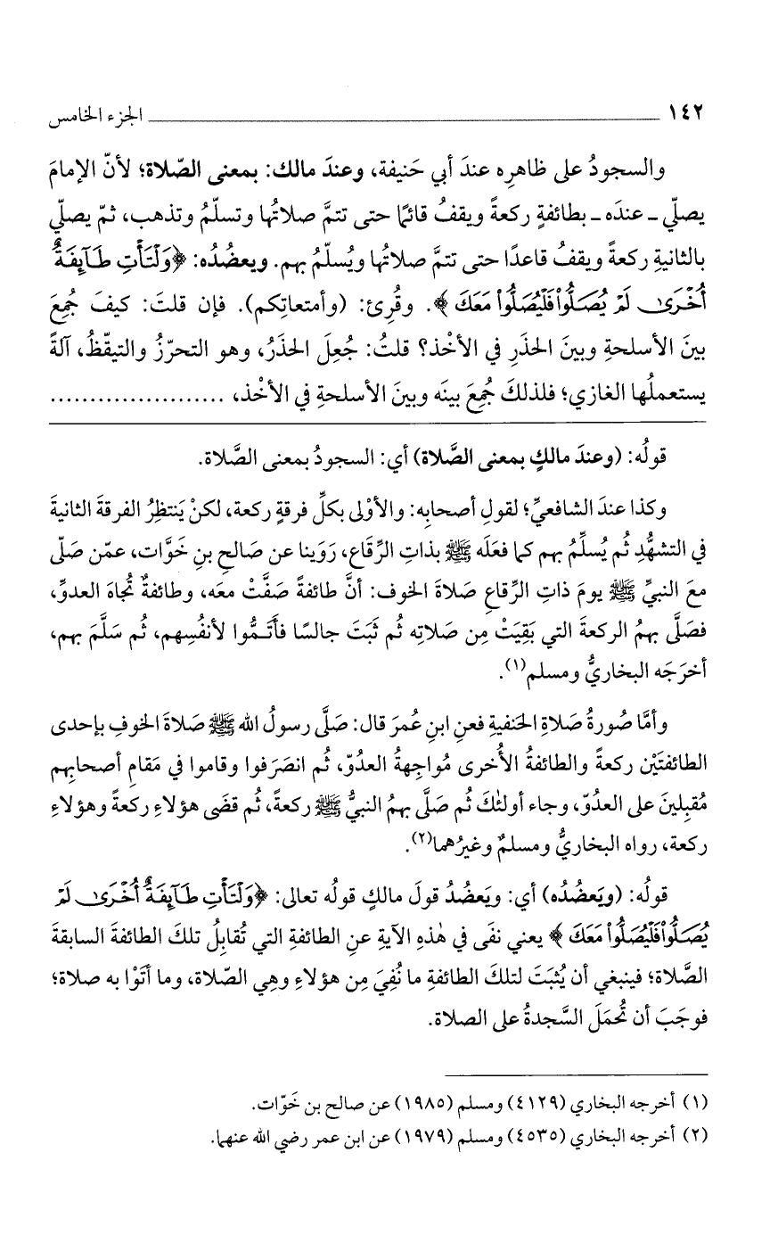 والسجود على ظاهره عند أبي حنيفة، وعند مالك: بمعنى الصلاة؛ لأن الإمام يصلي- عنده- بطائفةٍ ركعة ويقف قائماً حتى تتم صلاتها وتسلم وتذهب، ثم يصلي بالثانية ركعة ويقف قاعداً حتى تتم صلاتها ويسلم بهم. ويعضده: (وَلْتَاتِ طائِفَةٌ أُخْرى لَمْ يُصَلُّوا فَلْيُصَلُّوا مَعَكَ). وقرئ: (وأمتعاتكم). فإن قلت: كيف جمع بين الأسلحة وبين الحذر في الأخذ؟ قلت: جعل الحذر، وهو التحرّز والتيقظ، آلة يستعملها الغازي، فلذلك جمع بينه وبين الأسلحة في الأخذ، ...