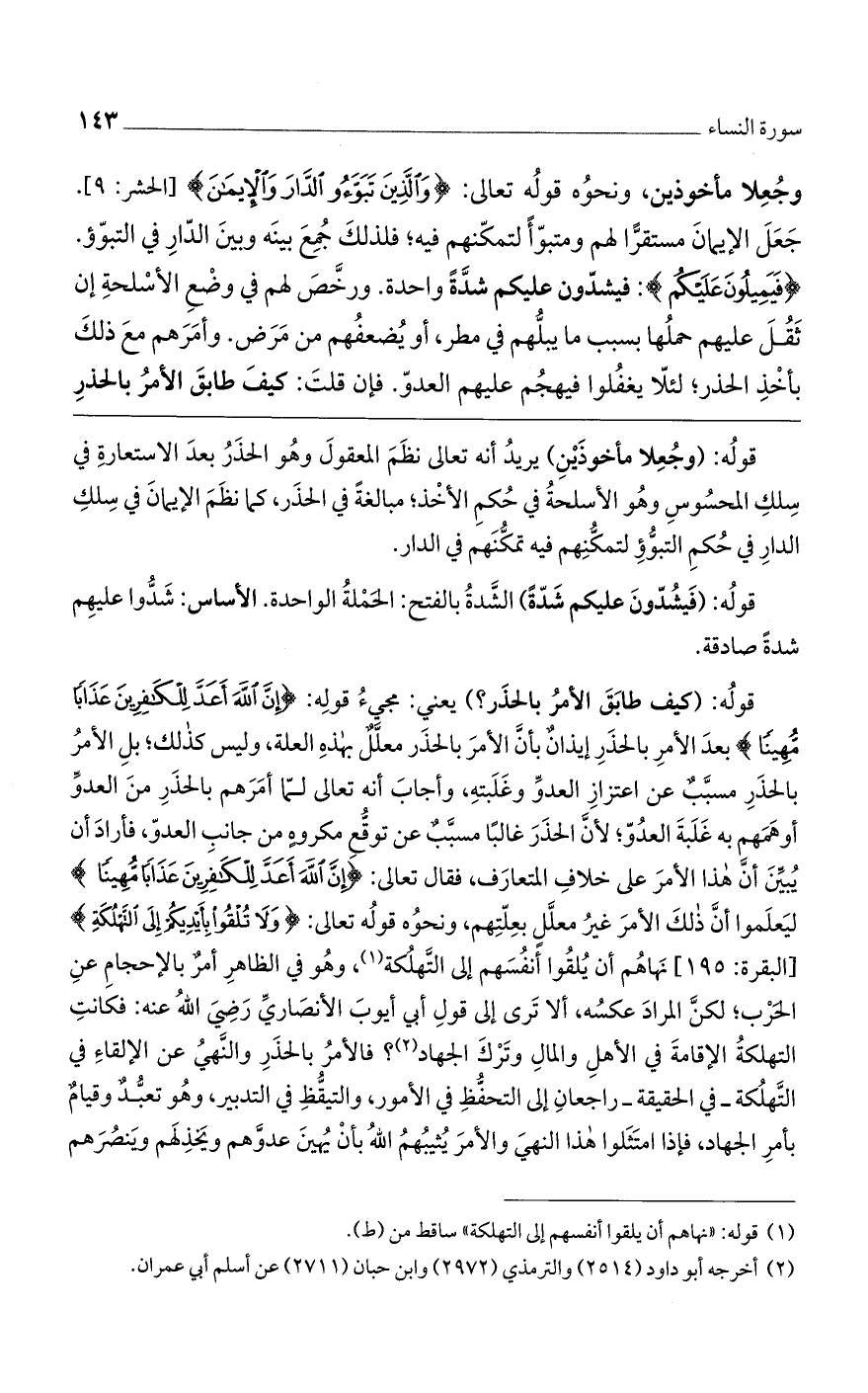 قوله: (كيف طابق الأمر بالحذر؟ ) يعني: مجيء قوله: {إِنَّ اللَّهَ أَعَدَّ لِلْكَافِرِينَ عَذَاباً مُهِيناً} بعد الأمر بالحر إيذان بأن الأمر بالحذر معلل بهذه العلة، وليس كذلك؛ بل الأمر بالحذر مسبب عن اعتزاز العدو وغلبته، وأجاب أنه تعالى لما أمرهم بالحذر من العدو أوهمهم به غلبة العدو؛ لأن الحذر غالباً مسبب عن توقع مروه من جانب العدو، فأراد أن يبين أن هذا الأمر على خلاف المتعارف، فقال تعالى: {إِنَّ اللَّهَ أَعَدَّ لِلْكَافِرِينَ عَذَاباً مُهِيناً} ليعلموا أن ذلك الأمر غير معلل بعلتهم، ونحوه قوله تعالى: {وَلا تُلْقُوا بِأَيْدِيكُمْ إِلَى التَّهْلُكَةِ} [البقرة: 195] نهاهم أن يلقوا أنفسهم إلى التهلكة، وهو في الظاهر أمر بالإحجام عن الحرب؛ لكن المراد عكسه، ألا ترى إلى قول أبي أيوب الأنصاري رضي الله عنه: فكانت التهلكة الإقامة في الأهل والمال وترك الجهاد؟ فالأمر بالحذر والنهي عن الإلقاء في التهلكة - في الحقيقة- راجعان إلى التحفظ في الأمور، والتيقظ في التدبير، وهو تعمد وقاية بأمر الجهاد، فإذا امتثلوا هذا النهي والأمر يثيبهم الله بأن يهين عدوهم ويحدهم ويبشرهم