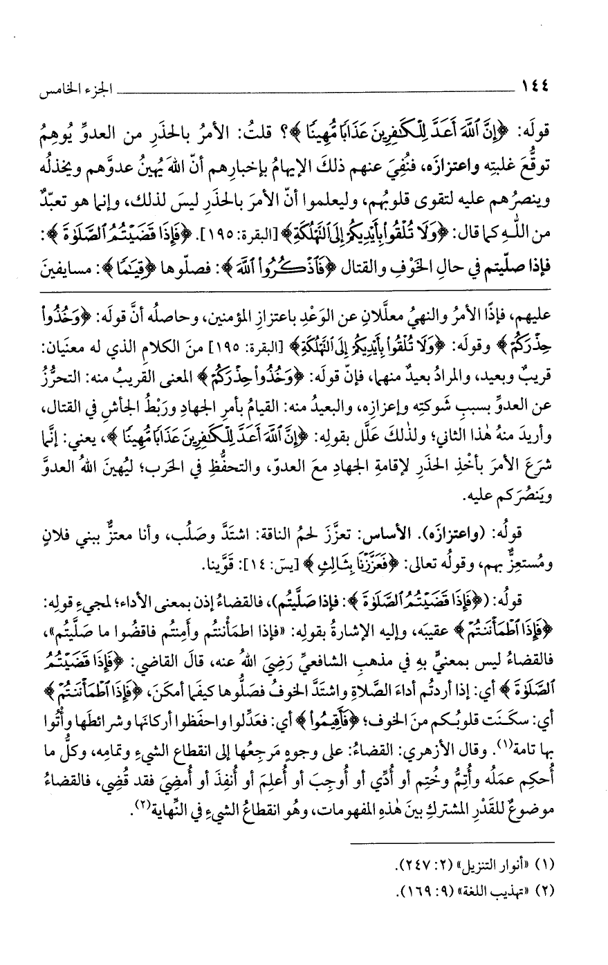 قوله: ({فَإِذَا قَضَيْتُمْ الصَّلاةَ}: فإذا صليتم)، فالقضاء إذن بمعنى الأداء؛ لمجيء قوله: {فَإِذَا اطْمَانَنتُمْ} عقيبه، وإليه الإشارة بقوله: "فإذا اطمأننتم وأمنتم فاقضوا ما صليتم"، فالقضاء ليس بمعنيٍّ به في مذهب الشافعي رضي الله عنه، قال القاضي: {فَإِذَا قَضَيْتُمْ الصَّلاةَ} أي: إذا أرتم أداء الصلاة واشتد الخوف فصلوها كيفما أمكن، {فَإِذَا اطْمَانَنتُمْ} أي: سنت قلوبكم من الخوف؛ {فَأَقِيمُوا} أي: فعدلوا واحفظوا أركانها وشرائطها وأتوا بها تامة. وقال الأزهري: القضاء: على وجوه مرجعها إلى انقطاع الشيء وتمامه، وكل ما أُحكِم عمله وأُتم وخُتم أو أُدى أو أُوجب أو أُعلم أو أُنفذ أو أُمضي فقد قُضي، فالقضاء موضوع للقدر المشترك بين هذه المفهومات، وهو انقطاع الشيء في النهاية.