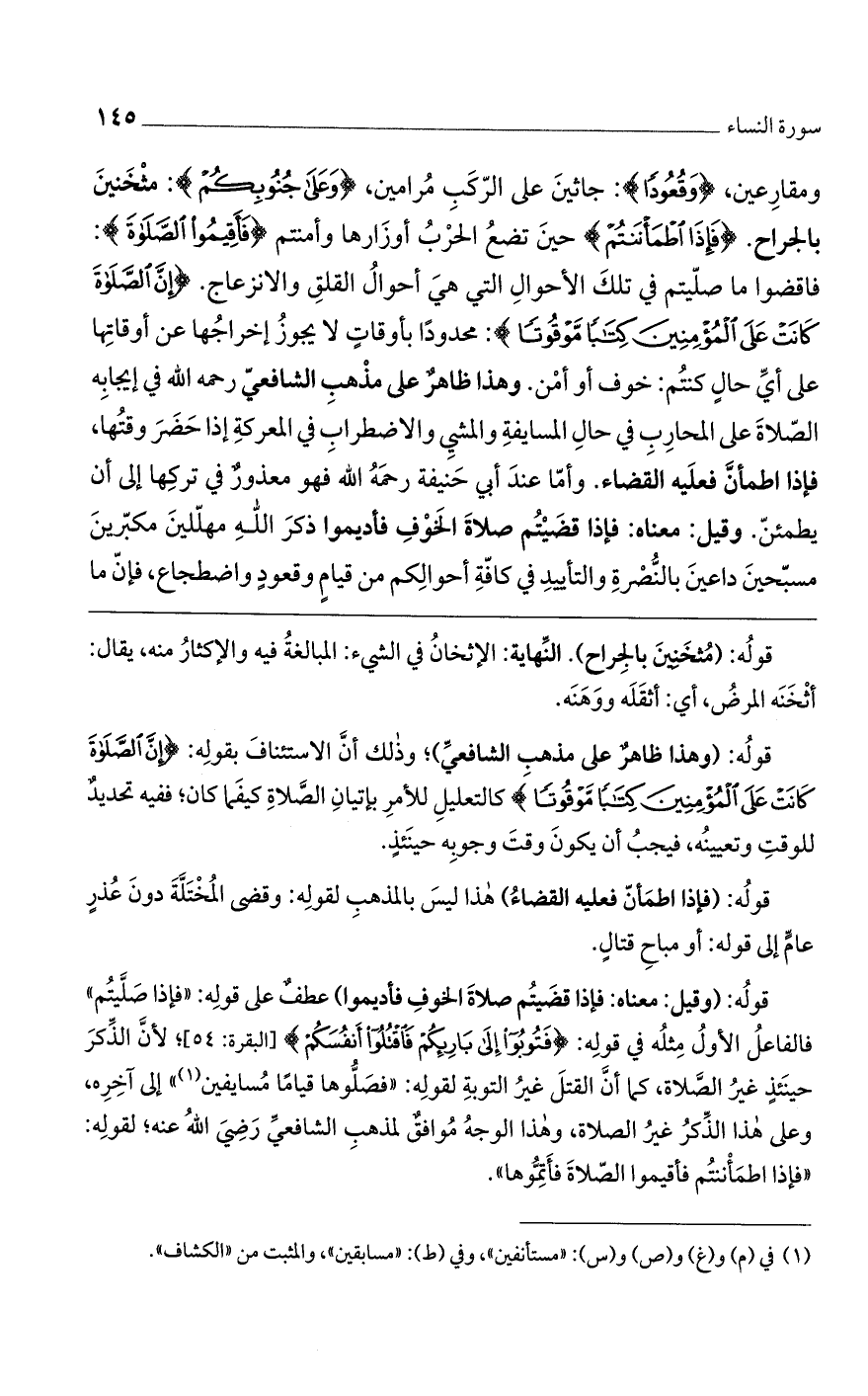 ومقارعين، (وَقُعُوداً): جاثين على الركب مرامين، (وَعَلى جُنُوبِكُمْ): مثخنين بالجراح. (فَإِذَا اطْمَانَنْتُمْ) حين تضع الحرب أوزارها وأمنتم (فَأَقِيمُوا الصَّلاةَ) فاقضوا ما صليتم في تلك الأحوال التي هي أحوال القلق والانزعاج. (إِنَّ الصَّلاةَ كانَتْ عَلَى الْمُؤْمِنِينَ كِتاباً مَوْقُوتاً): محدوداً بأوقاتٍ لا يجوز إخراجها عن أوقاتها على أي حالٍ كنتم: خوف أو أمن. وهذا ظاهرٌ على مذهب الشافعي رحمه اللَّه في إيجابه الصلاة على المحارب في حالة المسايفة والمشي والاضطراب في المعركة إذا حضر وقتها، فإذا اطمأن فعليه القضاء. وأما عند أبي حنيفة رحمه اللَّه فهو معذور في تركها إلى أن يطمئن. وقيل: معناه: فإذا قضيتم صلاة الخوف فأديموا ذكر اللَّه مهللين مكبرين مسبحين داعين بالنصرة والتأييد في كافة أحوالكم من قيام وقعود واضطجاع، فإن ما
