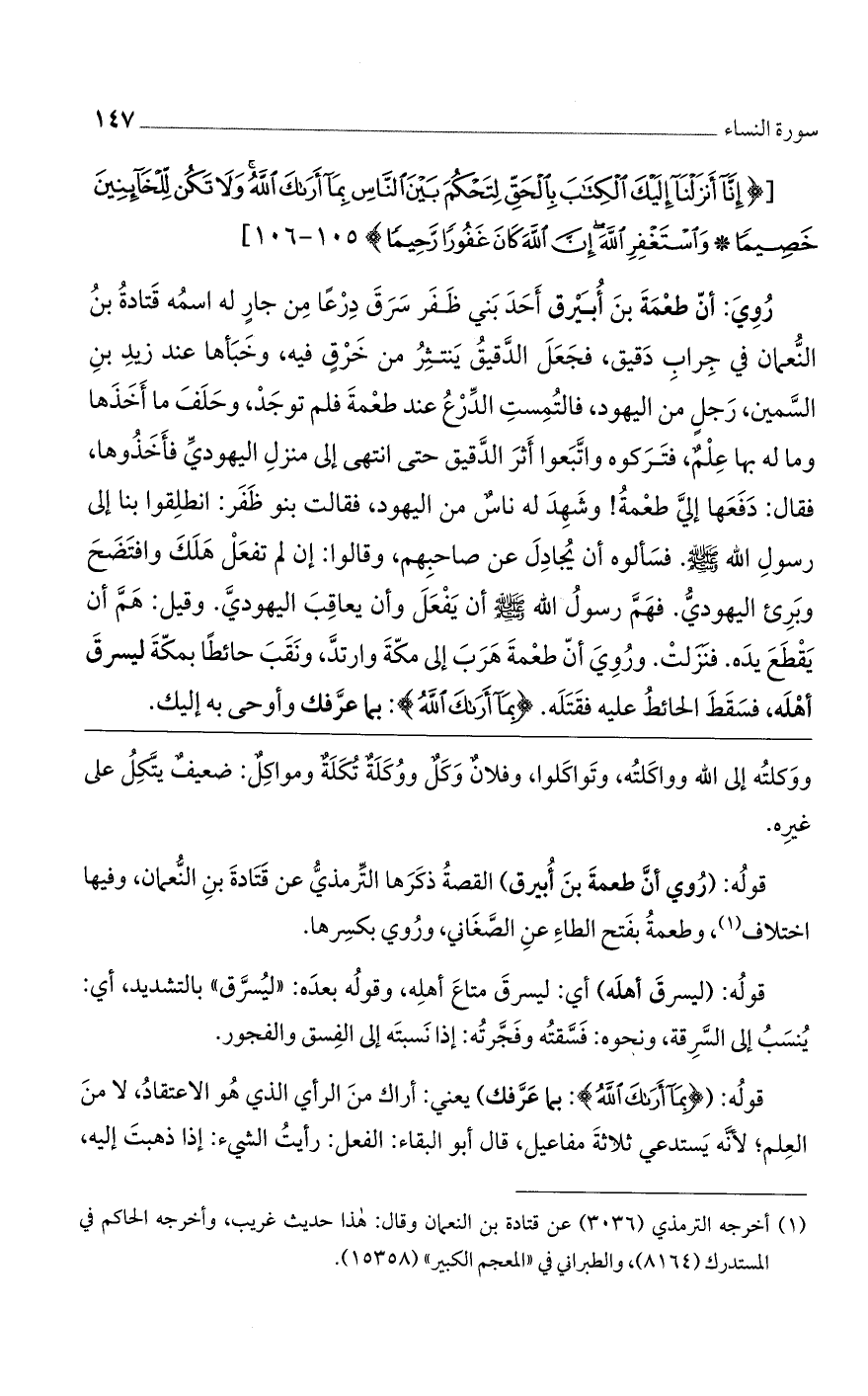 روي: أنّ طعمة بن أبيرق أحد بني ظفر سرق درعاً من جار له اسمه قتادة بن النعمان في جراب دقيق، فجعل الدقيق ينتثر من خرقٍ فيه، وخبأها عند زيد بن السمين، رجلٍ من اليهود، فالتمست الدرع عند طعمة فلم توجد، وحلف ما أخذها وما له بها علمٌ، فتركوه واتبعوا أثر الدقيق حتى انتهى إلى منزل اليهودي فأخذوها، فقال: دفعها إلىّ طعمة! وشهد له ناسٌ من اليهود، فقالت بنو ظفر: انطلقوا بنا إلى رسول اللَّه صلى اللَّه عليه وسلم. فسألوه أن يجادل عن صاحبهم وقالوا: إن لم تفعل هلك وافتضح وبرئ اليهودي. فهمَّ رسول اللَّه صلى اللَّه عليه وسلم أن يفعل وأن يعاقب اليهودي. وقيل: هم أن يقطع يده. فنزلت. وروي أن طعمة هرب إلى مكة وارتد، ونقب حائطاً بمكة ليسرق أهله، فسقط الحائط عليه فقتله. (بِما أَراكَ اللَّهُ): بما عرفك وأوحى به إليك.