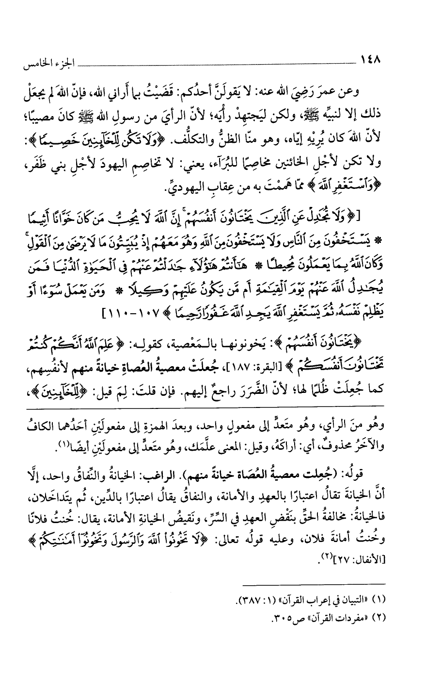 وعن عمر رضي اللَّه عنه: لا يقولنّ أحدكم قضيت بما أراني اللَّه، فإنّ اللَّه لم يجعل ذلك إلا لنبيه صلى اللَّه عليه وسلم، ولكن ليجتهد رأيه؛ لأن الرأي من رسول اللَّه صلى اللَّه عليه وسلم كان مصيباً؛ لأن اللَّه كان يريه إياه، وهو منا الظن والتكلف. (وَلا تَكُنْ لِلْخائِنِينَ خَصِيماً): ولا تكن لأجل الخائنين مخاصما للبرآء، يعني لا تخاصم اليهود لأجل بني ظفر، (وَاسْتَغْفِرِ اللَّهَ) مما هممت به من عقاب اليهودي.