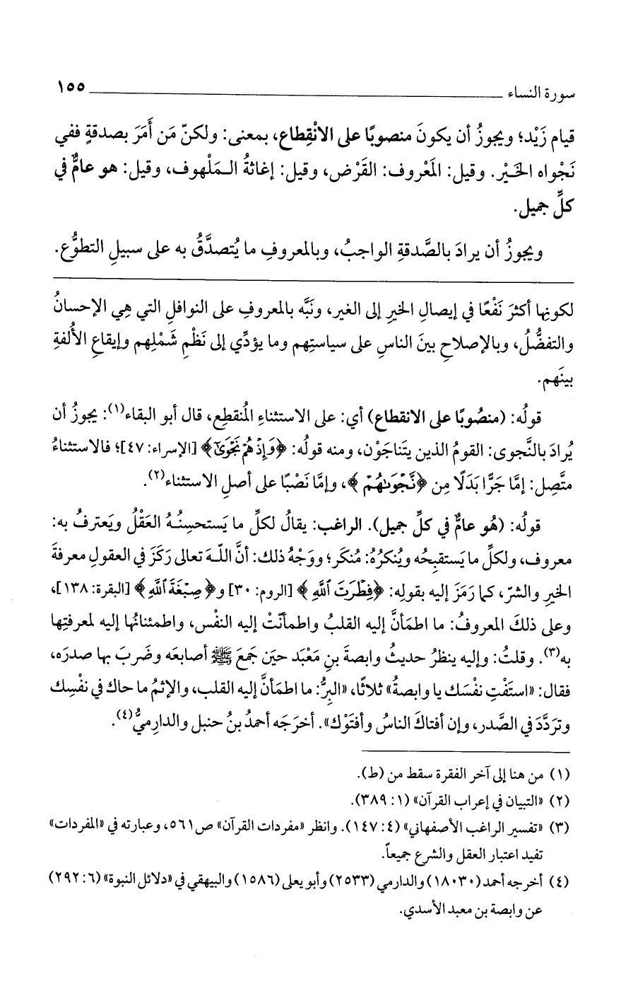 لكونها أكثر نفعاً في إيصال الخير إلى الغير، ونبه بالمعروف على النوافل التي هي الإحسان والتفضل، وبالإصلاح بين الناس على سياستهم وما يؤدي إلى نظم شملهم وإيقاع الألفة بينهم.