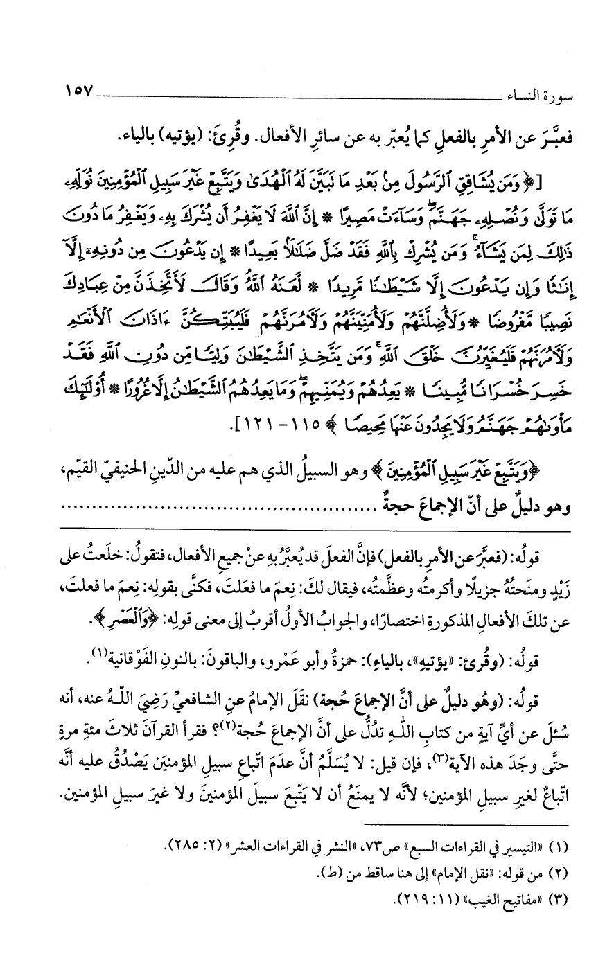 قوله: (وهو دليل على أن الإجماع حجة) نقل الإمام عن الشافعي رضي الله عنه، أنه سُئل عن أي آية من كتاب الله تدل على أن الإجماع حجة؟ فقرأ القرآن ثلاث مئة مرة حتى وجد هذه الآية، فإن قيل: لا يُسلم أن عدم اتباع سبيل المؤمنين يصدق عليه أنه اتباعٌ لغير سبيل المؤمنين؛ لأنه لا يمنع أن لا يتبع سبيل المؤمنين ولا غير سبيل المؤمنين.