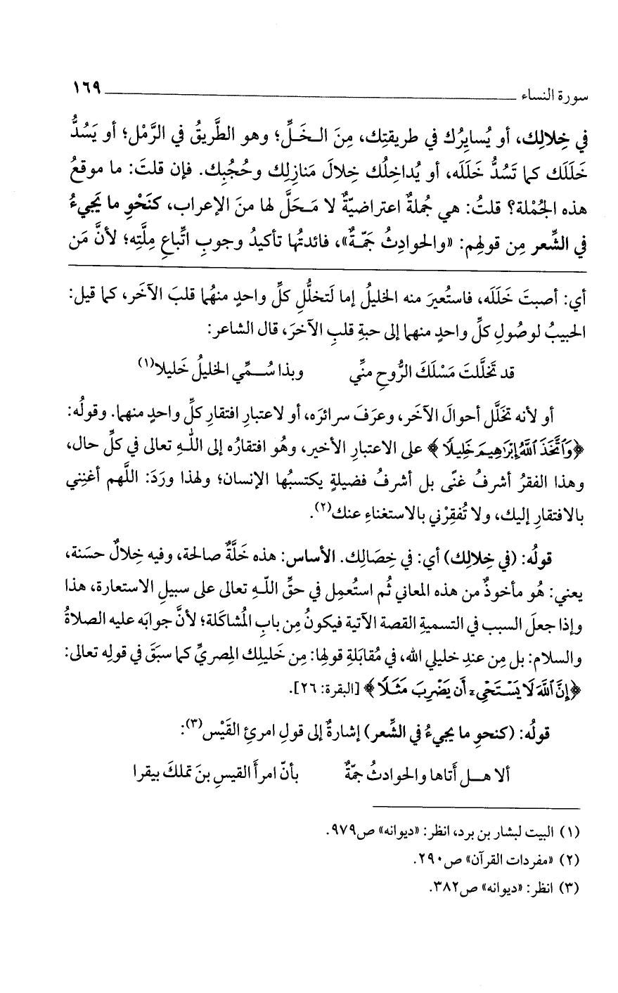 في خلالك، أو يسايرك في طريقك، من الخل؛ وهو الطريق في الرمل؛ أو يسدّ خللك كما تسدّ خلله، أو يداخلك خلال منازلك وحجبك. فإن قلت: ما موقع هذه الجملة؟ قلت: هي جملة اعتراضيةٌ لا محل لها من الإعراب، كنحو ما يجيء في الشعر من قولهم: "وَالْحَوَادِثُ جَمَّةٌ"، فائدتها تأكيد وجوب اتباع ملته؛ لأن من
