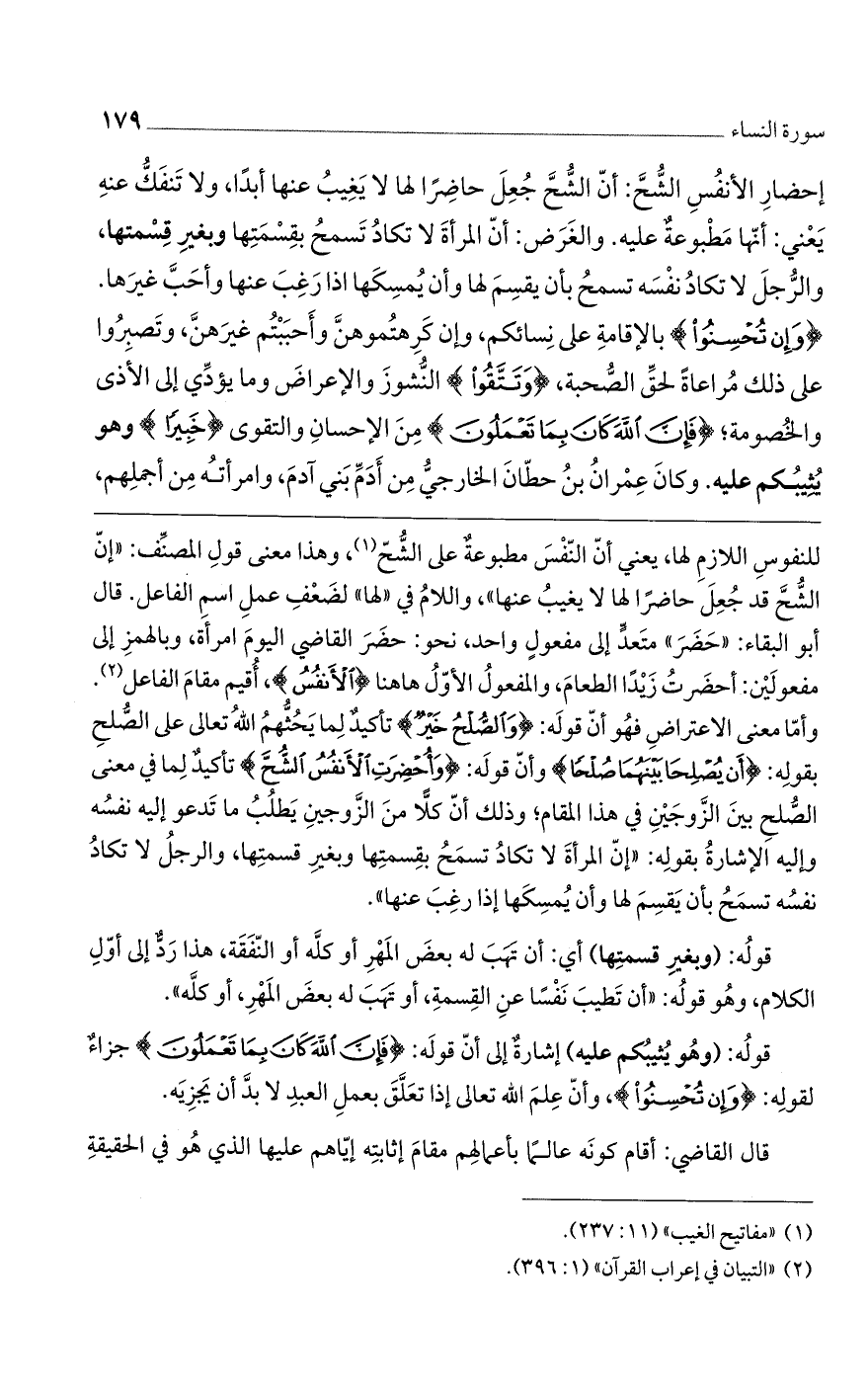 إحضار الأنفس الشح: أن الشح جعل حاضرا لها لا يغيب عنها أبداً ولا تنفك عنه، يعني أنها مطبوعة عليه. والغرض أن المرأة لا تكاد تسمح بقسمتها وبغير قسمتها، والرجل لا تكاد نفسه تسمح بأن يقسم لها وأن يمسكها إذا رغب عنها وأحب غيرها. (وَإِنْ تُحْسِنُوا) بالإقامة على نسائكم وإن كرهتموهن وأحببتم غيرهن، وتصبروا على ذلك مراعاة لحق الصحبة، (وَتَتَّقُوا) النشوز والإعراض وما يؤدي إلى الأذى والخصومة؛ (فَإِنَّ اللَّهَ كانَ بِما تَعْمَلُونَ) من الإحسان والتقوى (خَبِيراً) وهو يثيبكم عليه. وكان عمران بن حطان الخارجي من أدمّ بنى آدم، وامرأته من أجملهم،