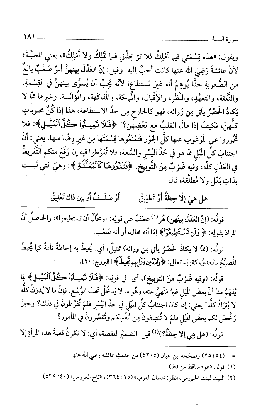 قوله: (إن العدل بينهن) هو عطف على قوله: "ومحال أن تستطيعوا"، والحاصل أن المراد بقوله: {وَلَنْ تَسْتَطِيعُوا} إما أنه محال، أو أنه صعب.