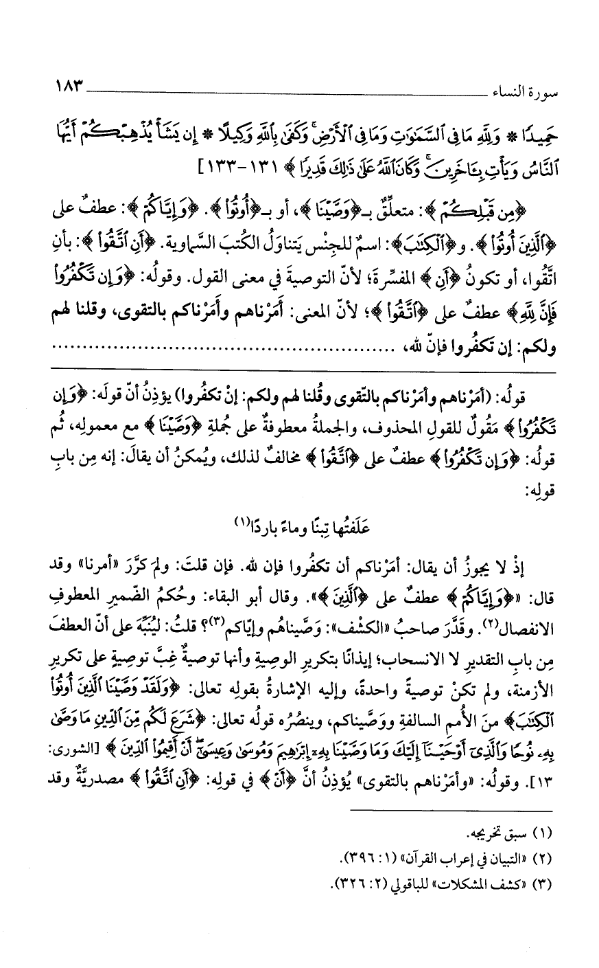 (مِنْ قَبْلِكُمْ): متعلق بـ (وصينا)، أو بـ (أوتوا). (وَإِيَّاكُمْ): عطفٌ على (الَّذِينَ أُوتُوا). و (الْكِتابَ): اسم للجنس يتناول الكتب السماوية. (أَنِ اتَّقُوا): بأن اتقوا، أو تكون (أن) المفسرة؛ لأنّ التوصية في معنى القول. وقوله: (وَإِنْ تَكْفُرُوا فَإِنَّ لِلَّهِ) عطف على (اتقوا)؛ لأنّ المعنى: أمرناهم وأمرناكم بالتقوى، وقلنا لهم ولكم: إن تكفروا فإنّ للَّه،