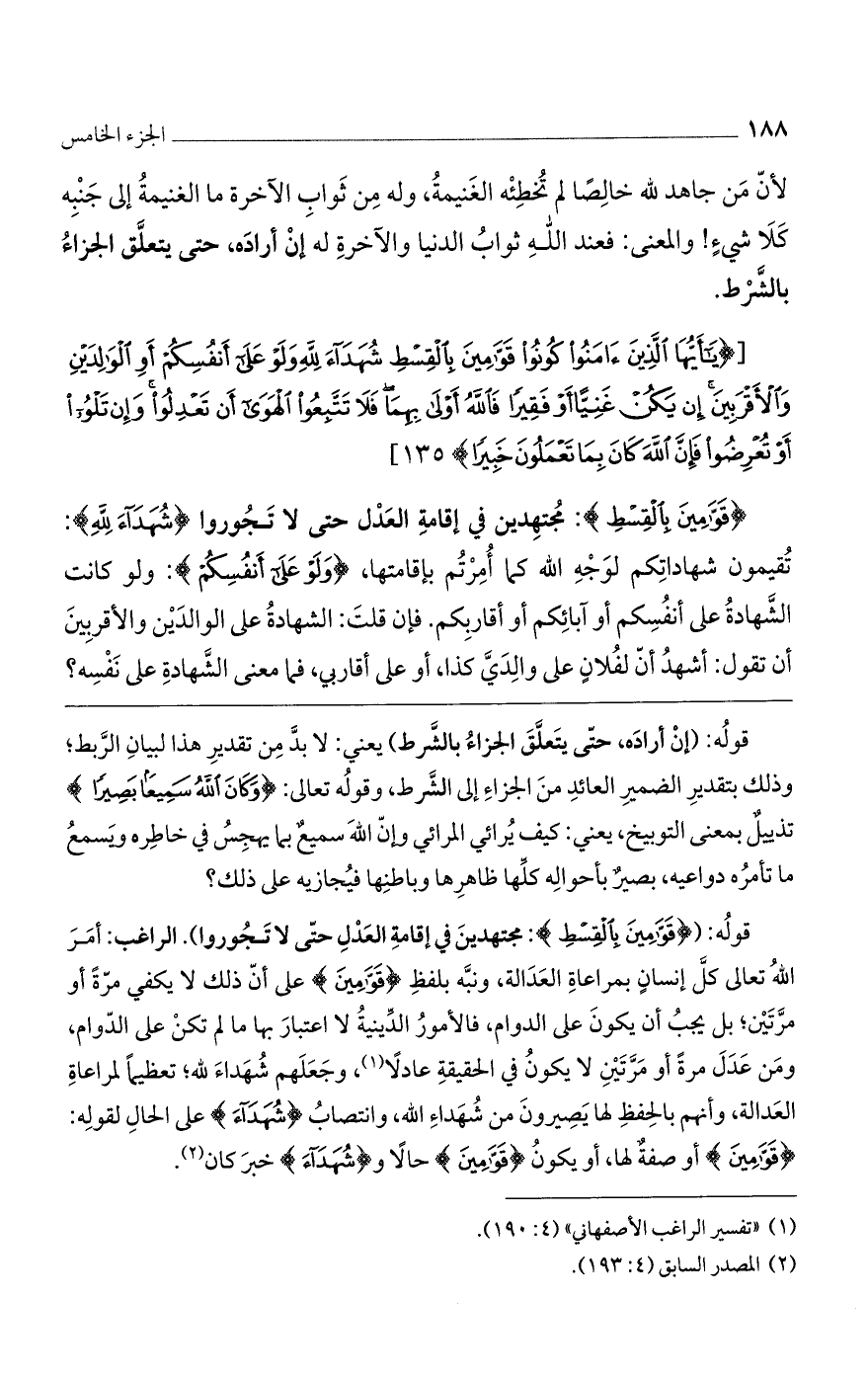 قوله: {قَوَّامِينَ بِالْقِسْطِ}: مجتهدين في إقامة العدل حتى لا تجوروا). الراغب: أمر الله تعالى كل إنسان بمراعاة العدالة، ونبه بلفظ {قَوَّامِينَ} على أن ذلك لا يكفي مرة أو مرتين؛ بل يجب أن يكون على الدوام، فالأمور الدينية لا اعتبار بها ما لم تكن على الدوام، ومن عدل مرة أو مرتين لا يكون في الحقيقة عادلاً، وجعلهم شهداء لله؛ تعظيماً لمراعاة العدالة، وأنهم بالحفظ لها يصيرون من شهداء الله، وانتصاب {شُهَدَاءَ} على الحال لقوله: {قَوَّامِينَ} أو صفة لها، أو يكون {قَوَّامِينَ} حالاً و {شُهَدَاءَ} خبر كان.