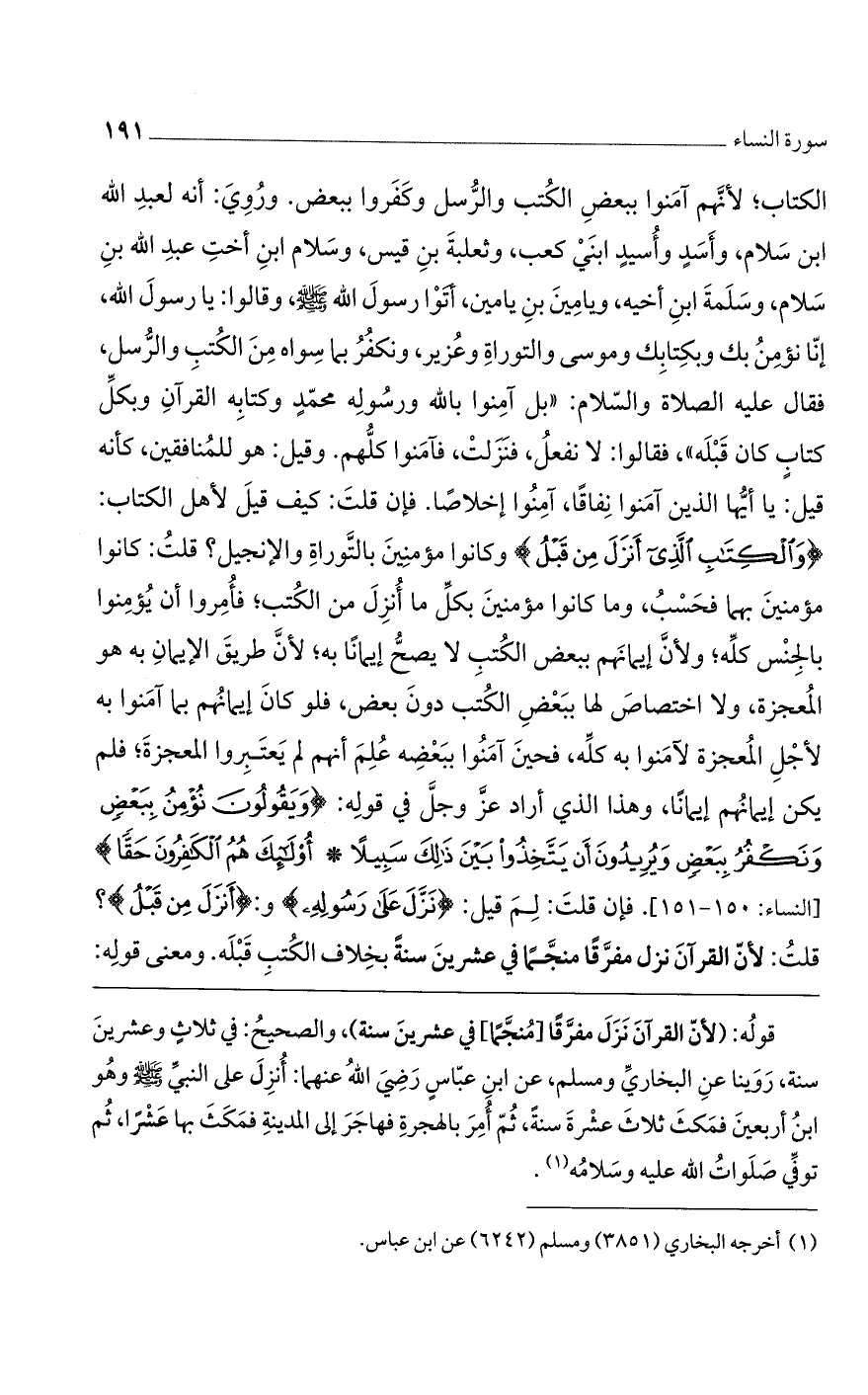 قوله: (لأن القرآن نزل مفرقاً [منجماً] في عشرين سنة]، والصحيح: في ثلاث وعشرين سنة، روينا عن البخاري ومسلم، عن ابن عباس رضي الله عنهما: أُنزل على النبي صلى الله عليه وسلم وهو ابن أربعين فمكث ثلاث عشرة سنة، ثم أمر بالهجرة فهاجر إلى المدينة فمكث بها عشراً، ثم توفى صلوات الله عليه وسلامه.