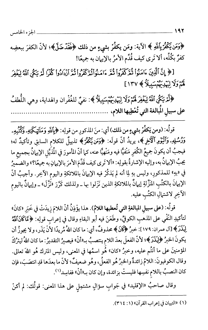 قوله: (ومن يكفر بشيء من ذلك) أي: من المذكور من قوله: {بِاللَّهِ وَمَلائِكَتِهِ وَكُتُبِهِ وَرُسُلِهِ وَالْيَوْمِ الآخِرِ}، يريد أن قوله: {وَمَنْ يَكْفُرْ} تذييل للكلام السابق وتأكيدٌ له؛ فيجب أن يكون جميع الكفر منفياً فيه ومنهياً عنه، كما أن المأمور في المذيل الإيمان بجميع ما يجب الإيمان به، وإليه الإشارة بقوله: "ألا ترى كيف قدم الأمر بالإيمان به جميعاً؟ " والضمير في "به" للمذكور، وليس به لما أنه لم يذكر فيه الإيمان بالملائكة واليوم الآخر. وأجيب أن الإيمان بالكتب المنزلة إيمانٌ بالملائكة الذين نزلوا بها- ولذلك كرر "نزَّلَ" - وإيمانٌ باليوم الآخر لاشتمال الكتب عليه.
