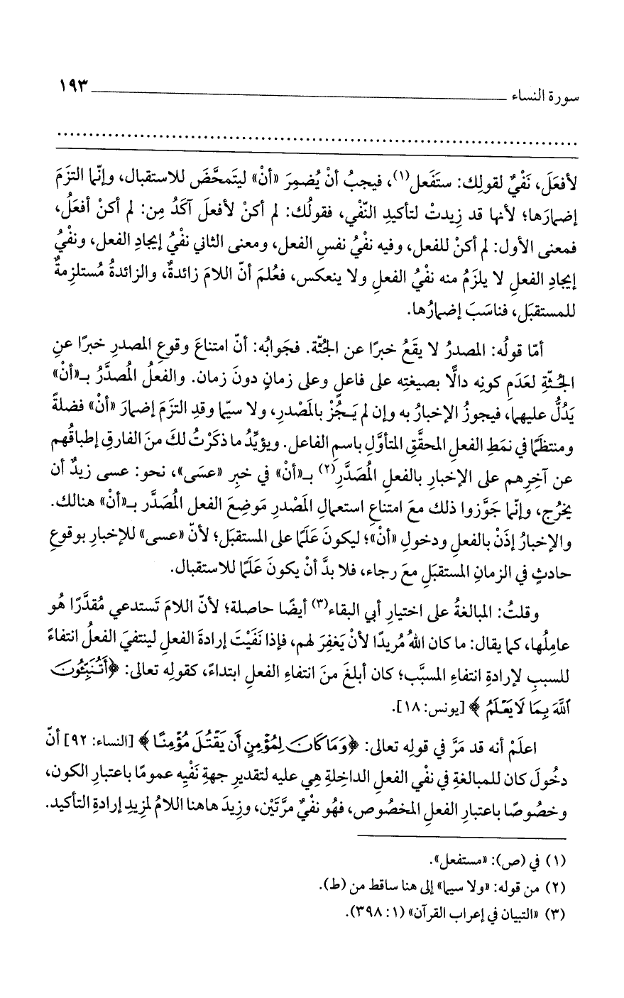 وقلتُ: المبالغة على اختيار أبي البقاء أيضاً حاصلة؛ لأن اللام تستدعي مُقدراً هو عاملها، كما يقال: ما كان الله مريداً لأن يغفر لهم، فإذا نفيت إرادة الفعل لينتفي الفعل انتفاء للسبب لإرادة انتفاء المسبب؛ كان أبلغ من انتفاء الفعل ابتداء، قوله تعالى: {أَتُنَبِّئُونَ اللَّهَ بِمَا لا يَعْلَمُ} [يونس: 18].