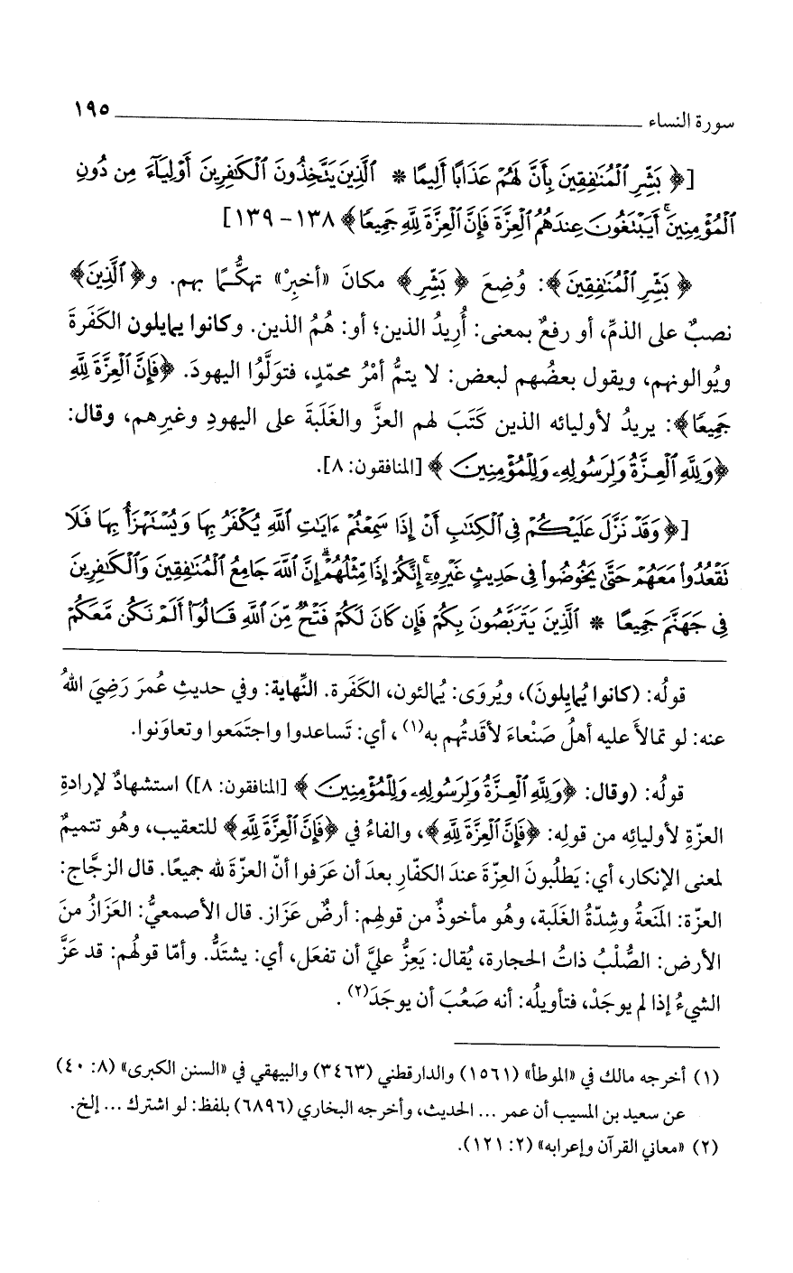 (بَشِّرِ الْمُنافِقِينَ): وضع (بَشِّرِ) مكان: "أخبر" تهكما بهم. و (الَّذِينَ) نصبٌ على الذمّ، أو رفعٌ بمعنى: أريد الذين، أو: هم الذين. وكانوا يمايلون الكفرة ويوالونهم، ويقول بعضهم لبعض: لا يتم أمر محمدٍ فتولوا اليهود. (فَإِنَّ الْعِزَّةَ لِلَّهِ جَمِيعاً): يريد لأوليائه الذين كتب لهم العز والغلبة على اليهود وغيرهم، وقال: (وَلِلَّهِ الْعِزَّةُ وَلِرَسُولِهِ وَلِلْمُؤْمِنِينَ) [المنافقون: 8].