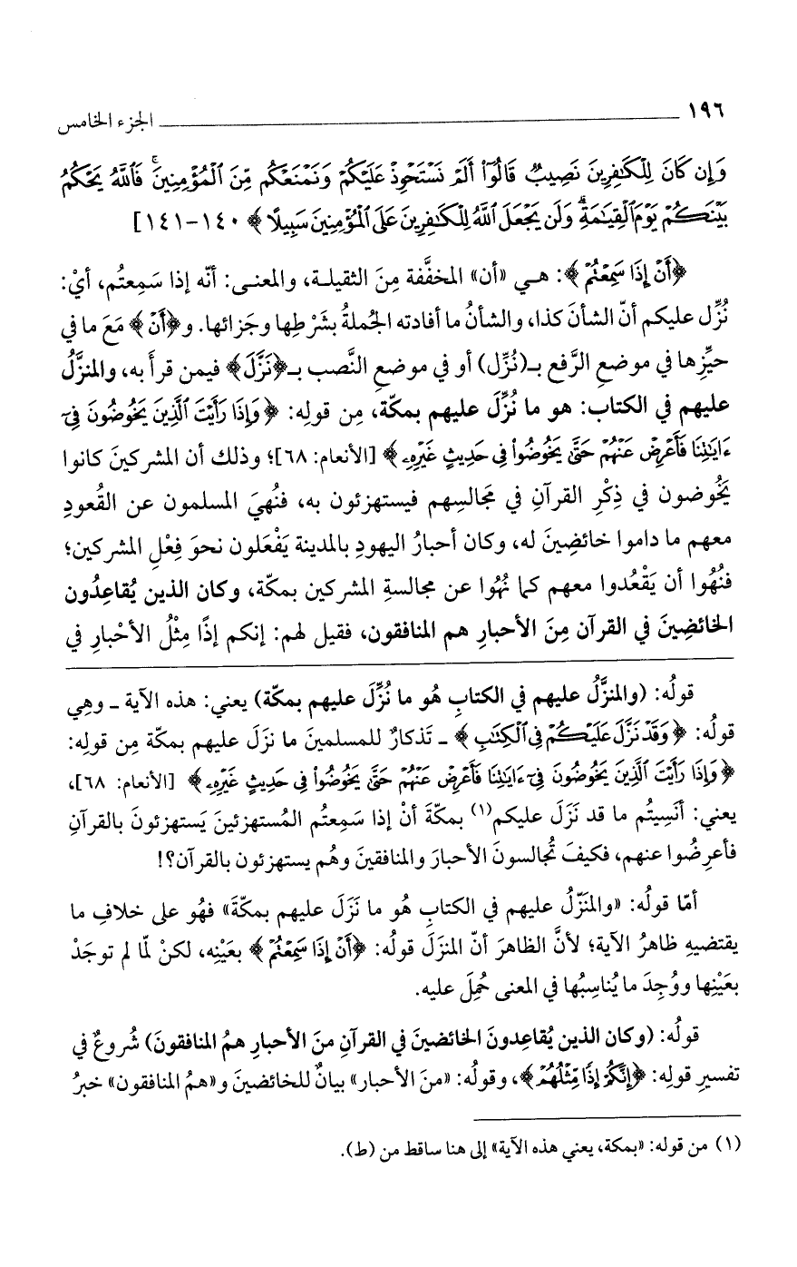 (أَنْ إِذا سَمِعْتُمْ) هي "أن" المخففة من الثقيلة، والمعنى: أنه إذا سمعتم، أي: نزل عليكم أنّ الشأن كذا، والشأن ما أفادته الجملة بشرطها وجزائها، و (أن) مع ما في حيزها في موضع الرفع بـ (نزل) أو في موضع النصب بـ (نزّل) فيمن قرأ به، والمنزل عليهم في الكتاب: هو ما نزل عليهم بمكة، من قوله: (وَإِذا رَأَيْتَ الَّذِينَ يَخُوضُونَ فِي آياتِنا فَأَعْرِضْ عَنْهُمْ حَتَّى يَخُوضُوا فِي حَدِيثٍ غَيْرِهِ) [الأنعام: 68]؛ وذلك أن المشركين كانوا يخوضون في ذكر القرآن في مجالسهم فيستهزئون به، فنهي المسلمون عن القعود معهم ما داموا خائضين له، وكان أحبار اليهود بالمدينة يفعلون نحو فعل المشركين، فنهوا أن يقعدوا معهم كما نهوا عن مجالسة المشركين بمكة، وكان الذين يقاعدون الخائضين في القرآن من الأحبار هم المنافقون، فقيل لهم: إنكم إذاً مثل الأحبار في
