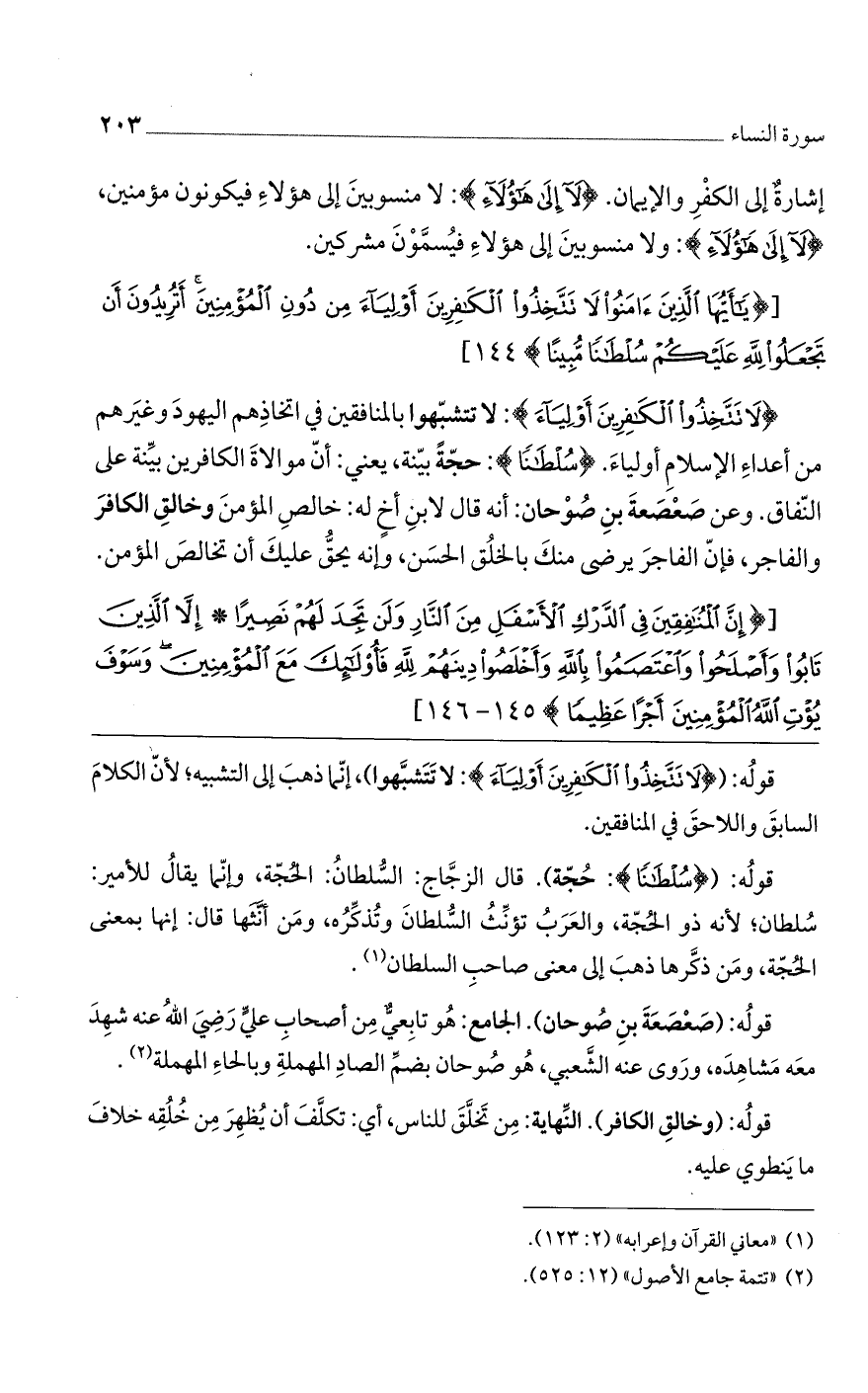 (لا تَتَّخِذُوا الْكافِرِينَ أَوْلِياءَ): لا تتشبهوا بالمنافقين في اتخاذهم اليهود وغيرهم من أعداء الإسلام أولياء. (سُلْطاناً): حجة بينة، يعني: أن موالاة الكافرين بينة على النفاق. وعن صعصعة ابن صوحان: أنه قال لابن أخٍ له: خالص المؤمن وخالق الكافر والفاجر، فإن الفاجر يرضى منك بالخلق الحسن، وإنه يحق عليك أن تخالص المؤمن.