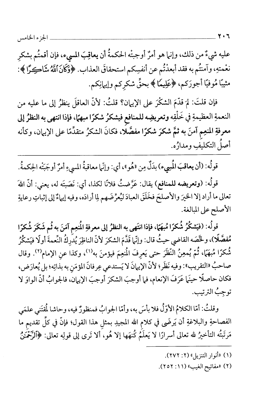 قوله: (فيشكر شكراً مبهماً، فإذا انتهى به النظر إلى معرفة المنعم آمن به ثم شكر شكراً مفصلاً)، ولخصه القاضي حيث قال: وإنما قدم الشكر لأن النظر يُدرك النعمة أولاً فيشكر شكراً مبهماً، ثم يمعن النظر حتى يعرف المنعم فيؤمن به، وكذا عن الإمام. وقال صاحب "التقريب": وفيه نظر؛ لأن الإيمان لا يستدعي عرفان المؤمن به بذاته؛ بل يعارض، فكان حاصلاً حينما عرف الإنعام، فما أوجب الشكر أوجب الإيمان، فالجواب أن الواو لا توجب الترتيب.