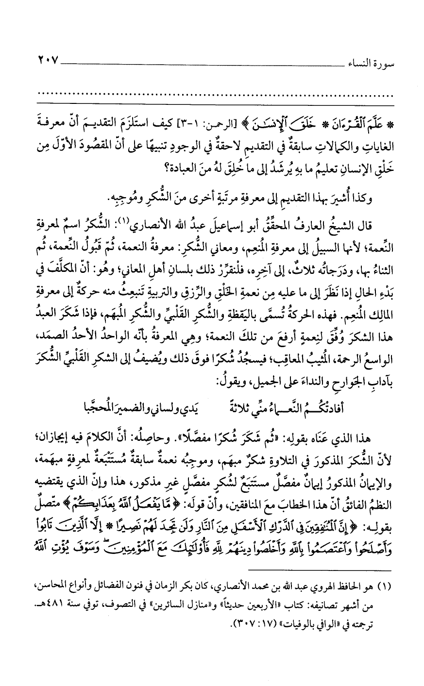 قال الشيخ العارف المحقق أبو إسماعيل عبد الله الأنصاري: الشكر اسم لمعرفة النعمة؛ لأنها السبيل إلى معرفة المنعم، ومعاني الشكر: معرفة النعمة، ثم قبول النعمة، ثم الثناء بها، ودرجاته ثلاث، إلى آخره، فلنقرر ذل بلسان أهل المعاني؛ وهو: أن المكلف في بدء الحال إذا نظر إلى ما عليه من نعمة الخلق والرزق والتربية تنبعث منه حركة إلى معرفة المالك المنعم. فهذه الحركة تسمى باليقظة والشكر القلبي والشكر المبهم، فإذا شكر العبد هذا الشكر وفق لنعمةٍ أرفع من تلك النعمة؛ وهي المعرفة بأنه الواحد الأحد الصمد، الواسع الرحمة، المثيب المعاقب؛ فيسجد شكراً فوق ذلك ويضيف إلى الشكر القلبي الشكر بآداب الجوارح والنداء على الجميل، ويقول: